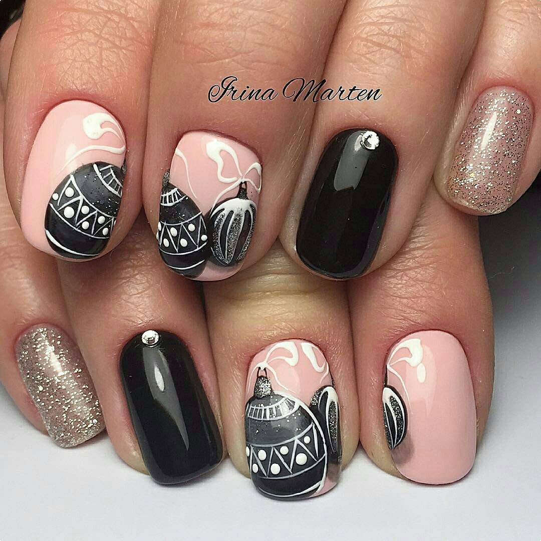 - Черный выигрышно смотрится со сверкающими элементами. Это как маленькое черное платье – классика, которая всегда уместна. А вот в гордом одиночестве он редко подходит для праздничного нейл-арта.