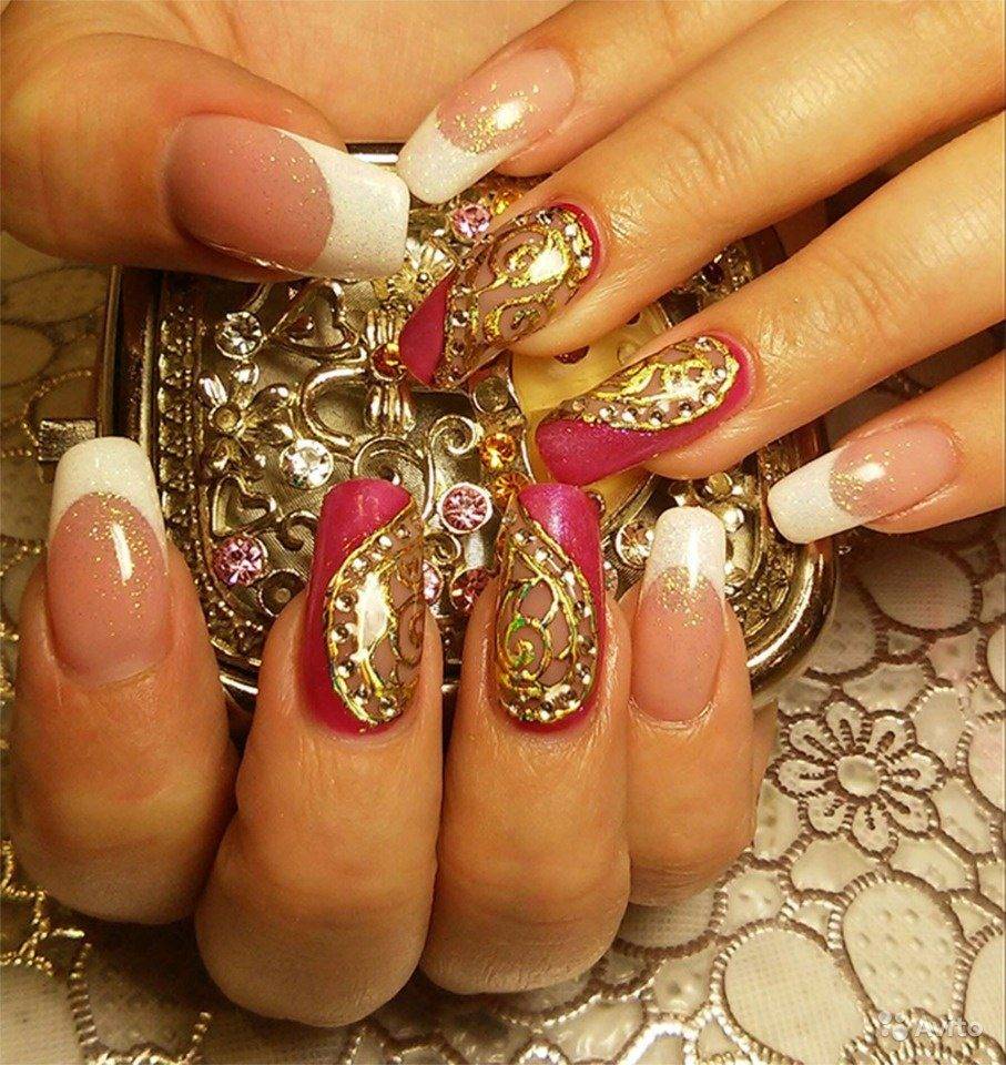 Очень современно и оригинально будет выглядеть блестящий французский маникюр на длинных острых ноготках или на ноготках формы балерина.