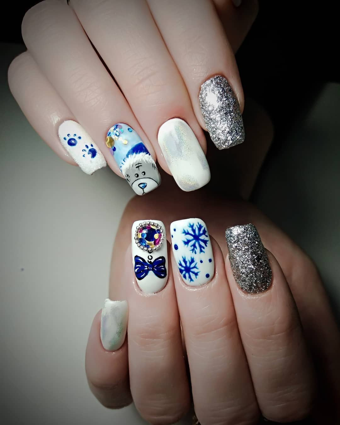 Отличный способ выделиться своим новогодним маникюром – выбрать голубой или синий цвет для фона. Яркие тона этих цветов хорошо сочетаются со спокойными оттенками: белыми, черными, серебристыми и т.д. Темный синий или насыщенный голубой могут сочетаться с любыми цветами, которые нужны для создания задуманного новогоднего дизайна.
