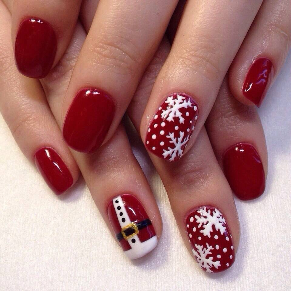 Новый год – отличная возможность проявить себя и покрыть ноготки лаком ярких красных тонов, особенно если такой нейл-арт сочетается с платьем. Подберите для себя интересный дизайн с новогодней тематикой. Белые снежинки, бантики, елочки на красном фоне будут смотреться броско и по-новогоднему привлекательно.