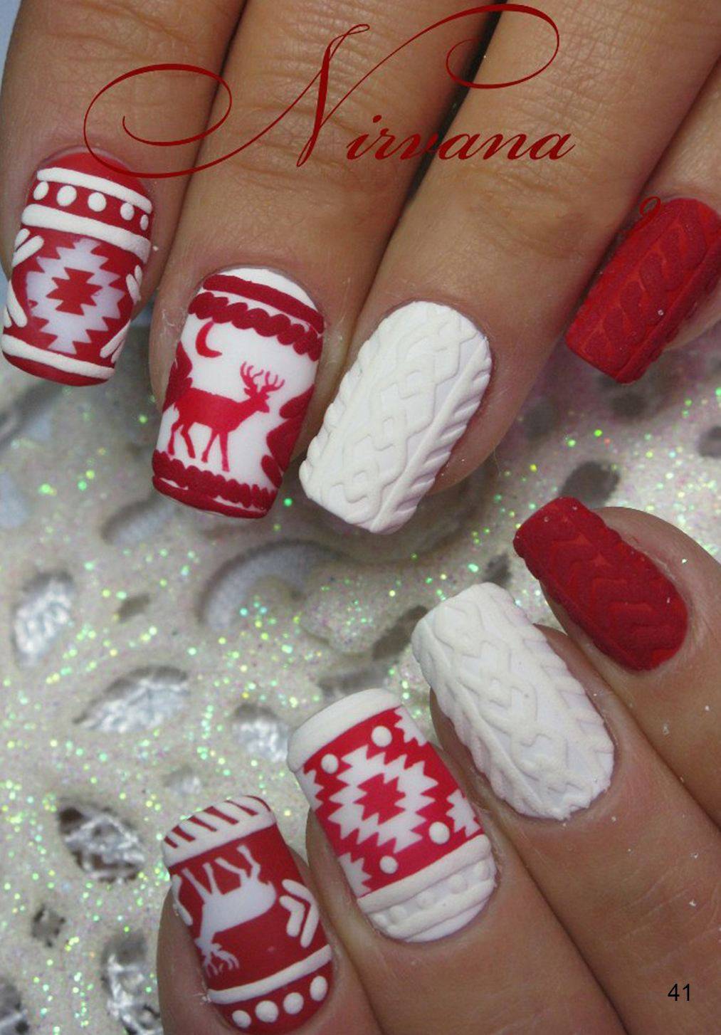 Для создания красивого новогоднего маникюра иногда наносят акриловую пудру, выполняя популярный узор «свитер». Такая «вязаная» техника декора идеально подходит для зимнего нейл-арта. Смотрите новые фото 2021 года и вдохновляйтесь перед походом в маникюрный салон.