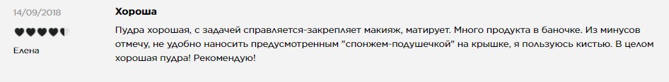 Преимущества: тонкий помол; в упаковке сразу есть спонж для нанесения; отлично матирует и закрепляет косметику; повышает стойкость макияжа; упаковка не требует дополнительных манипуляций – можно использовать продукт непосредственно из нее; подходит для всех типов кожи, особенно актуальна для жирной; крышка плотно прилегает к баночке, так что возможность просыпаний продукта исключена; не утяжеляет; легко наносится и распределяется по лицу; прошла дерматологическое тестирование; не вызывает угревой сыпи; не создает эффект “маски”; не сушит кожу; удобно подправлять макияж в течение дня; большой объем; доступная цена