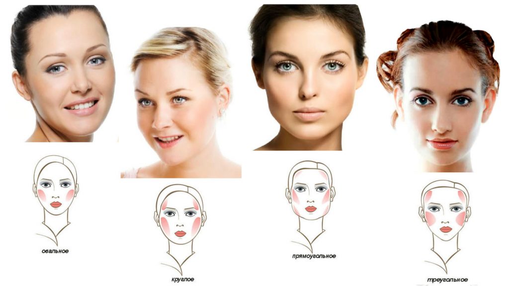 Прямоугольное лицо. Как и в случае с квадратным лицом, при макияже необходимо смягчить углы. Наносить румяна нужно наискось: от висков по направлению к носогубной складке. Затем растушевать по направлению к уголкам губ.