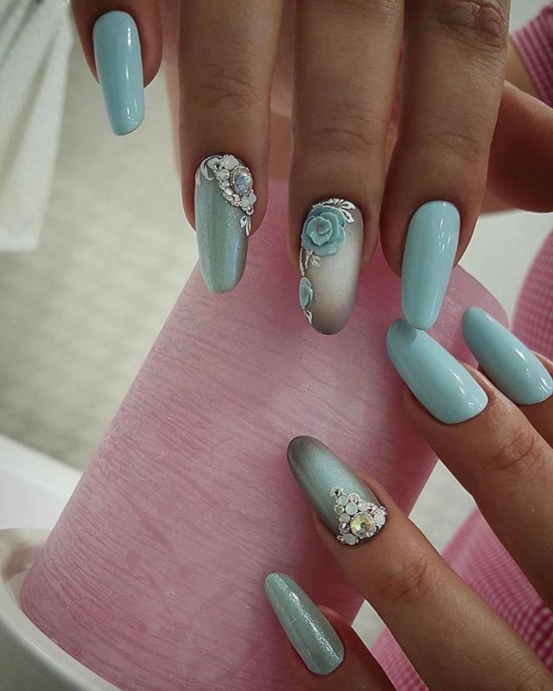 Стразы и бульонки. Бульонки чаще всего можно встретить серебристого (стального) цвета, но бывают и цветные варианты. А стразы, которые часто дополняются бульонками, бывают практически всех оттенков, так что вариантов для создания однотонного маникюра может быть множество.