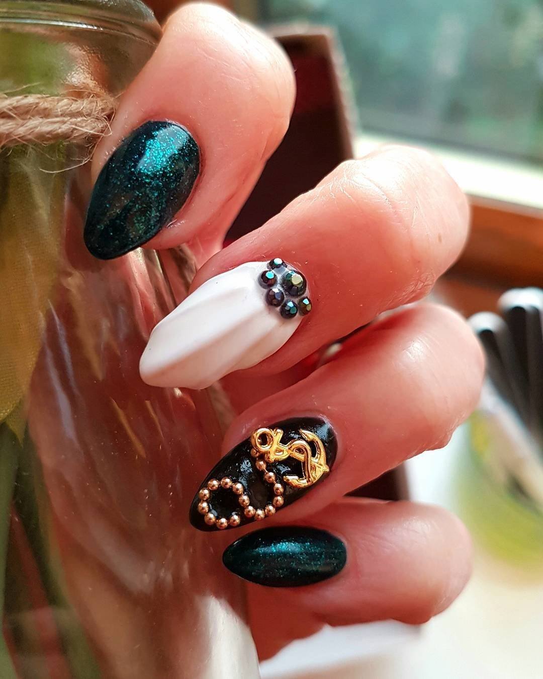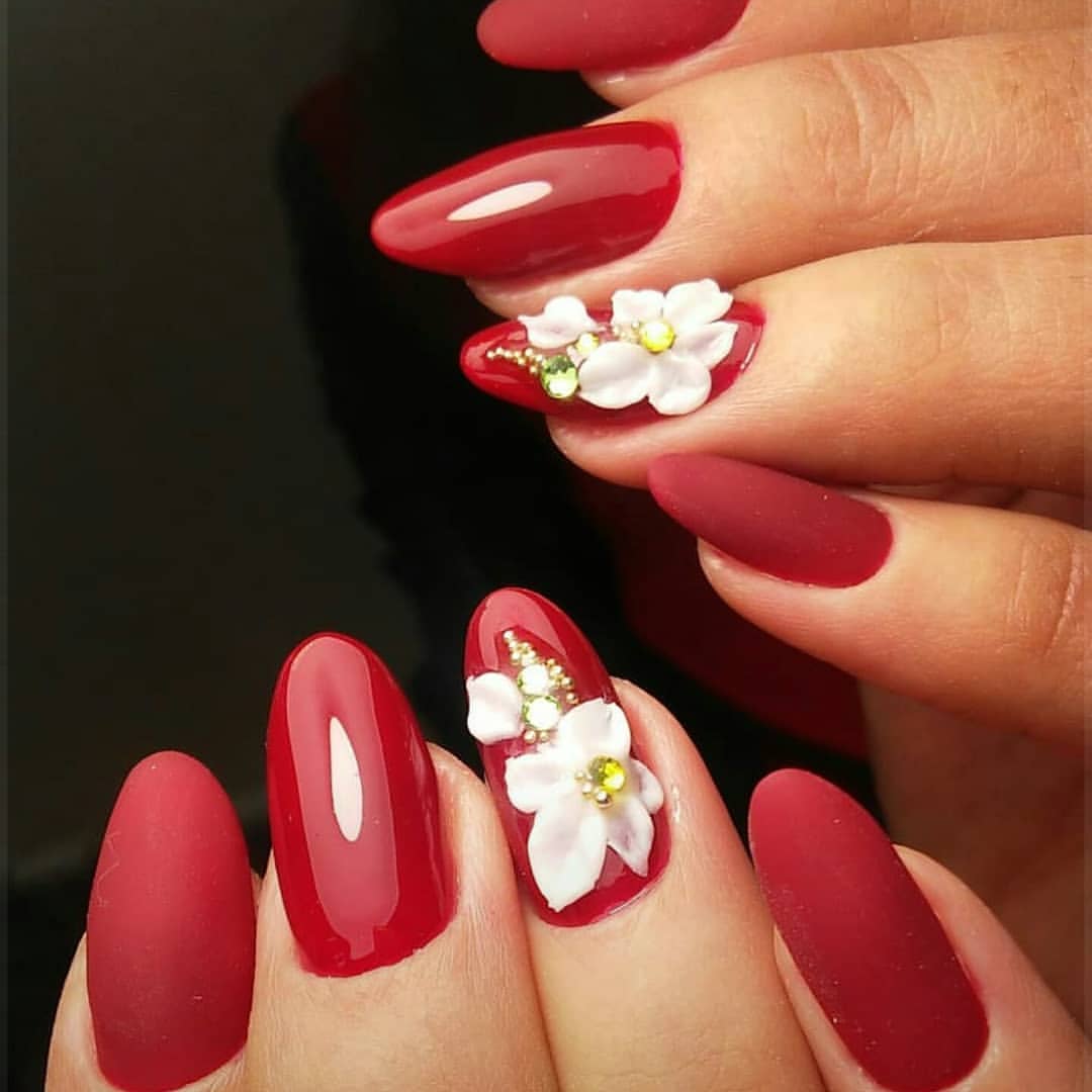 При желании можно сделать акцент на фактуре. То есть использовать не только глянцевое покрытие, но и матовое. Смотрится это не менее привлекательно. Кроме того, отличной идеей будет сочетание глянцевого и матового финиша в одном маникюре. Что касается дополнительного декора, то его стоит использовать в небольшом количестве на одном-двух ноготках.