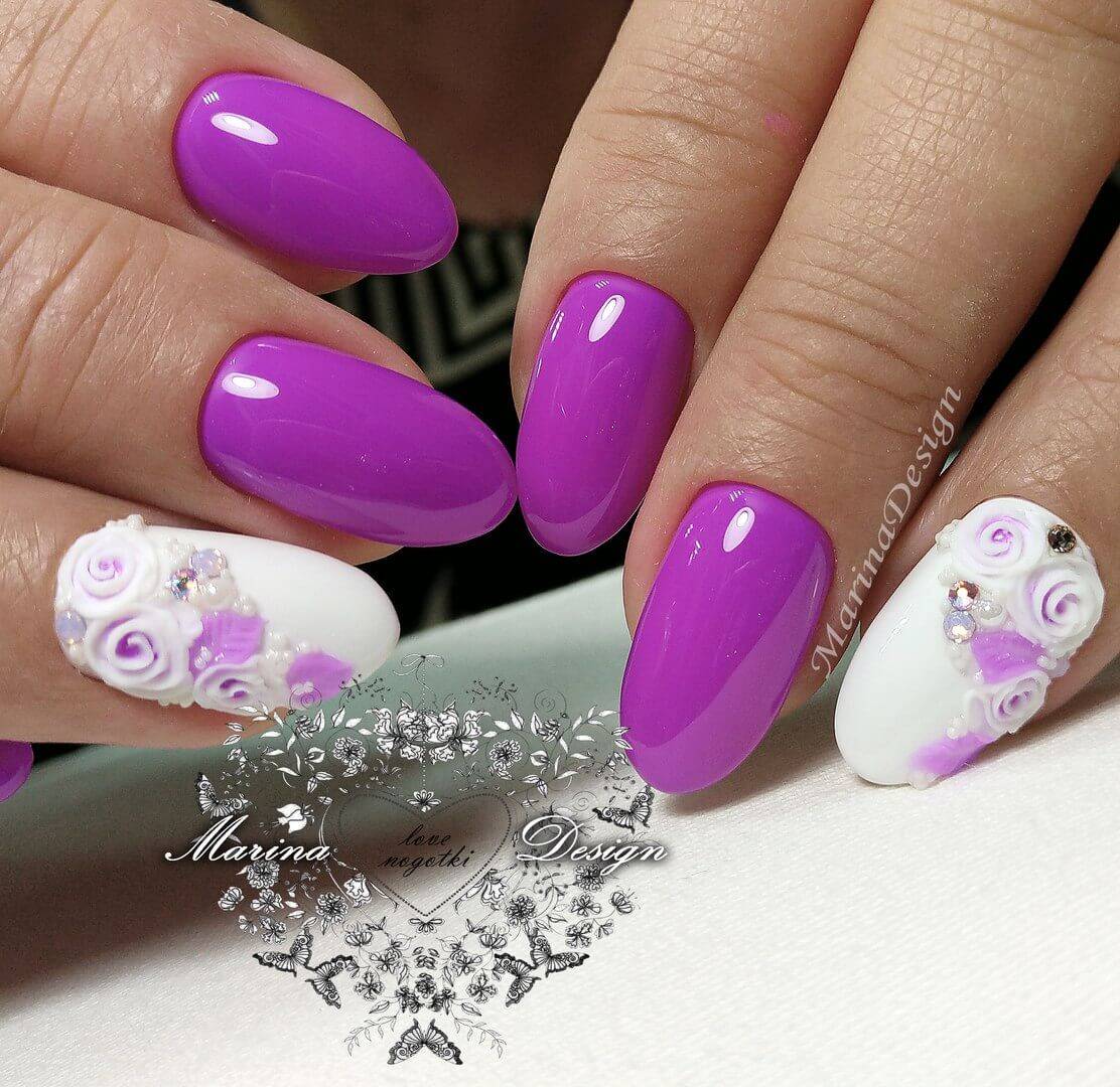 При создании свадебного маникюра стоит учитывать образ невесты. Часто для торжества используют перчатки, в которых 3D-маникюр будет просто неуместным. Для подобных торжеств используйте объемный дизайн из густого гель-лака в несколько слоев, несколько страз, кружевной декор.