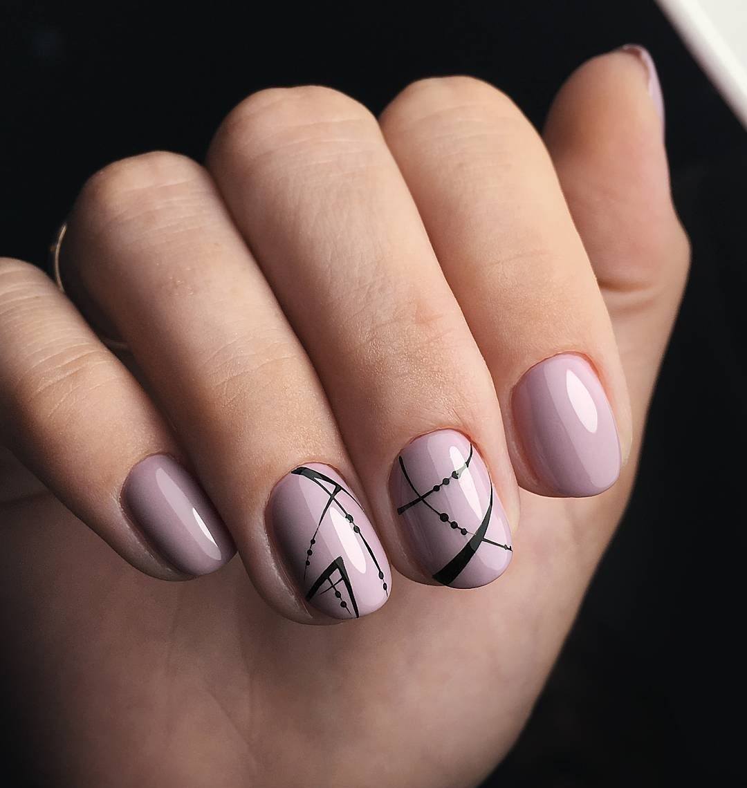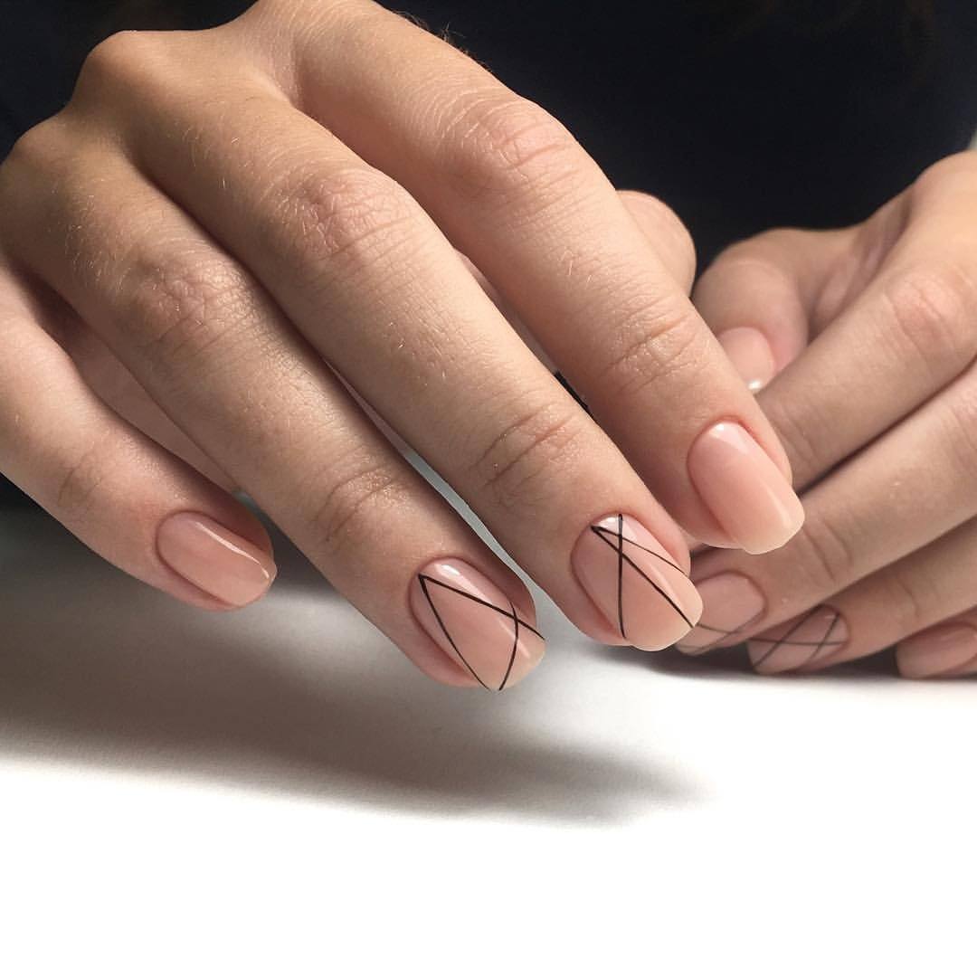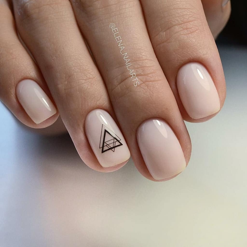 Стильная геометрия. Универсальный и абсолютно непритязательный дизайн, который легко впишется в деловой аутфит. Ноготки можно украшать, как одним геометрическим элементом, расположенным ровно посередине пластины, так и сразу несколькими фигурами, которые в сочетании образуют целый узор. Что до цветовой гаммы, подложку в данном случае следует делать светлой, например, в оттенке слоновой кости, а вот сами рисунки уже оформлять в чёрном или тёмно-сером цвете.