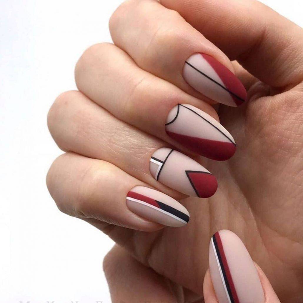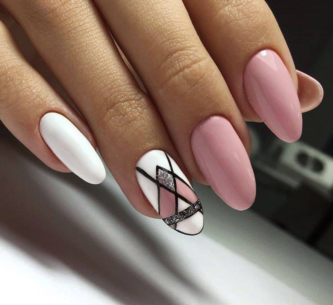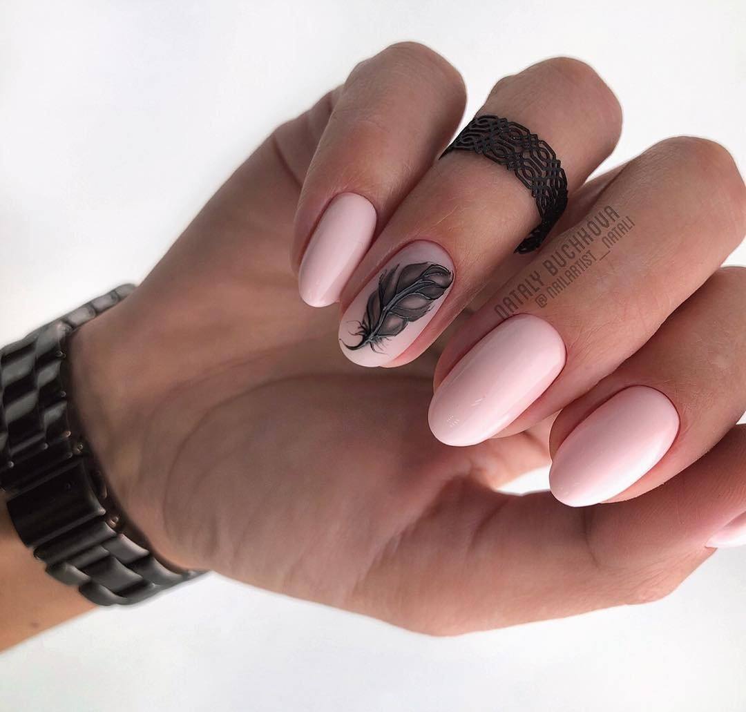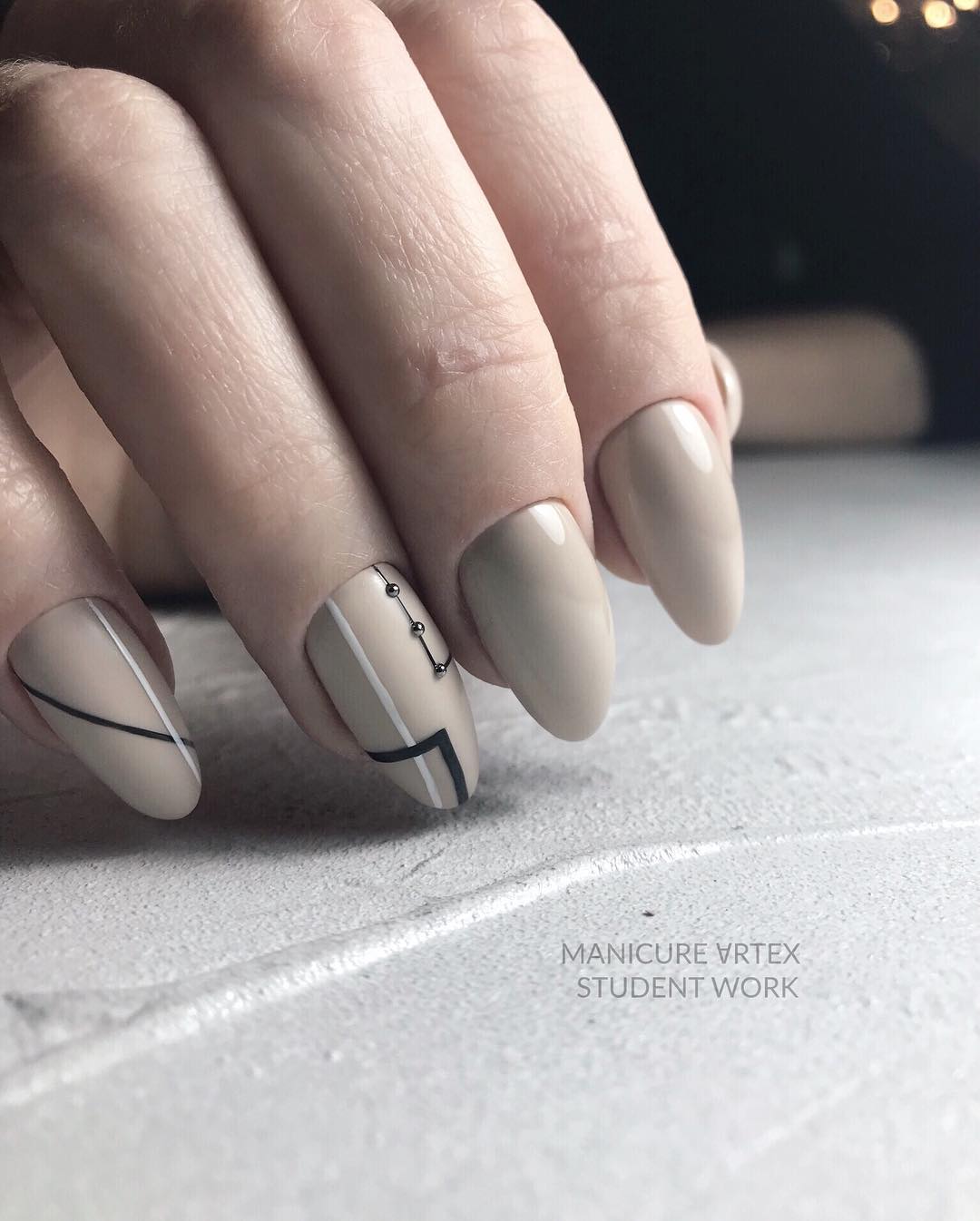 Стильная геометрия. Универсальный и абсолютно непритязательный дизайн, который легко впишется в деловой аутфит. Ноготки можно украшать, как одним геометрическим элементом, расположенным ровно посередине пластины, так и сразу несколькими фигурами, которые в сочетании образуют целый узор. Что до цветовой гаммы, подложку в данном случае следует делать светлой, например, в оттенке слоновой кости, а вот сами рисунки уже оформлять в чёрном или тёмно-сером цвете.