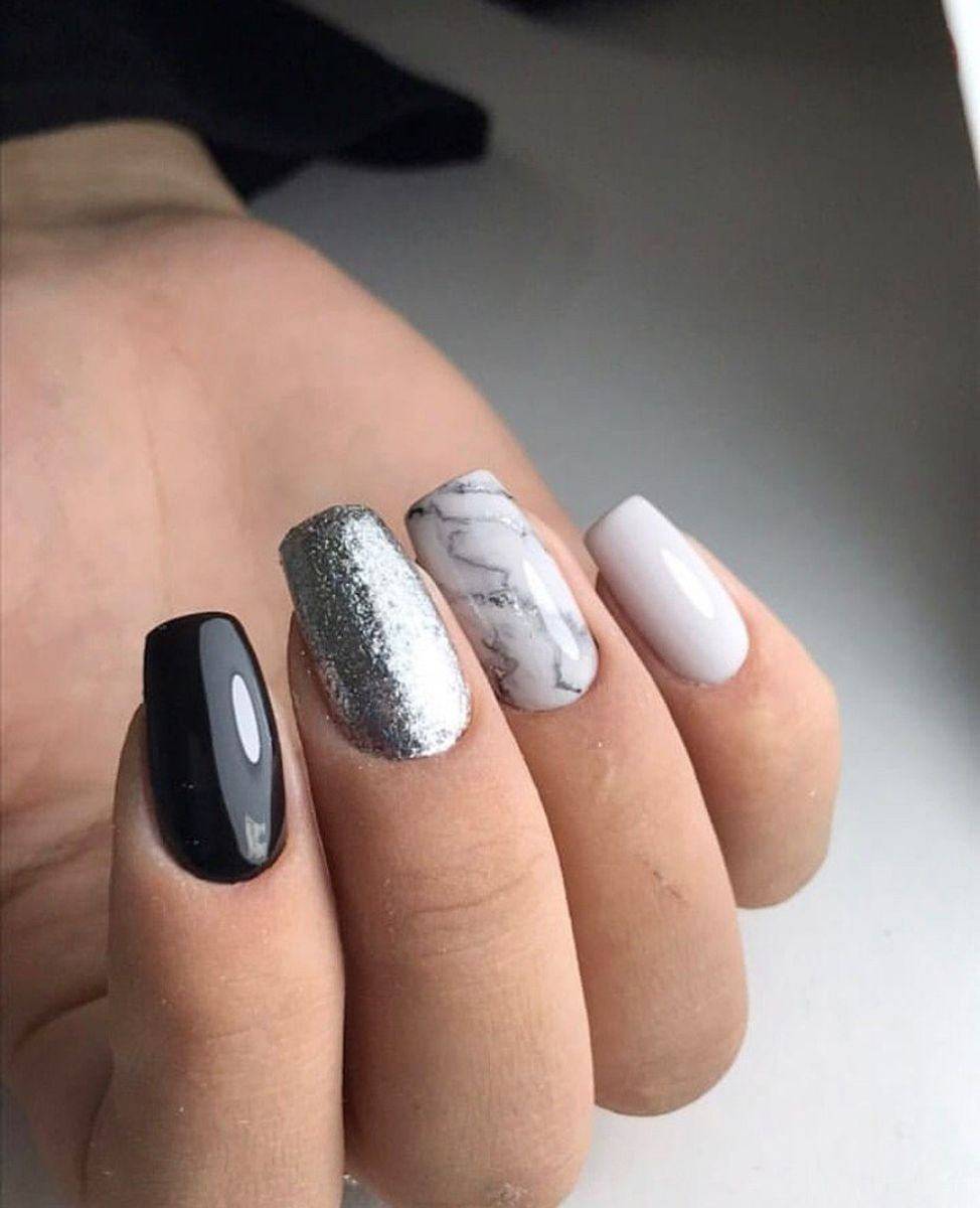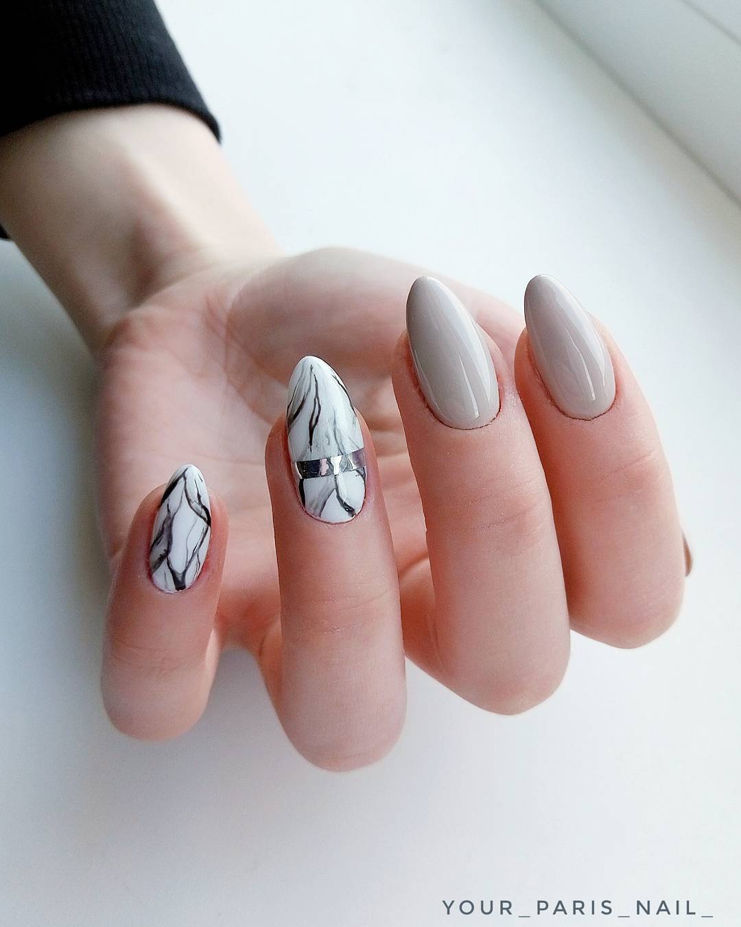 Мраморный. Любительницы креативных решений могут отдать своё предпочтение мраморному дизайну. Его особенность — это хаотично расположенные тонкие полоски, которые имитируют рисунок мрамора. В классическом исполнении используется серо-белая гамма. Однако, в этом году рекомендуется оформлять мраморный маникюр в розовом, золотом, синем и даже красном цвете.
