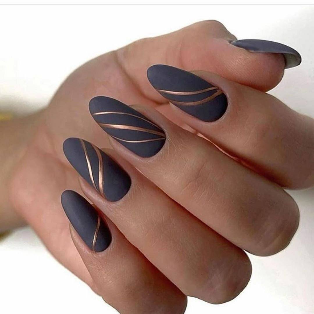 Матовая текстура придает дизайну официальности, сдержанности, а образу – элегантности. Эффект можно сделать с помощью акриловой пудры, посыпав ею последний слой гель-лака, и высушив в лампе. Дальнейшее покрытие не требуется. Второй вариант придания матовости – топ с матовым эффектом.