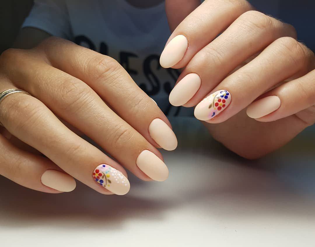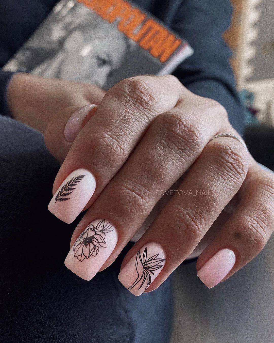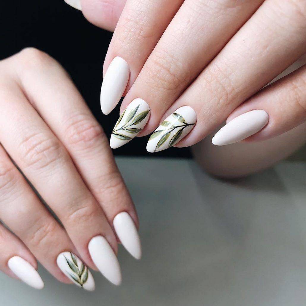 Офисный маникюр и маникюр минимализм – понятия синонимы. Оба этих направления отличаются сдержанностью оттенков и декора. Маникюр минимализм отлично смотрится в матовой текстуре с акцентными узорами в виде веточек и листочков. Узор выполняется с помощью стемпинга, так рисунок получается детальнее и заметнее.