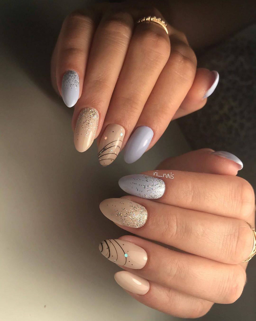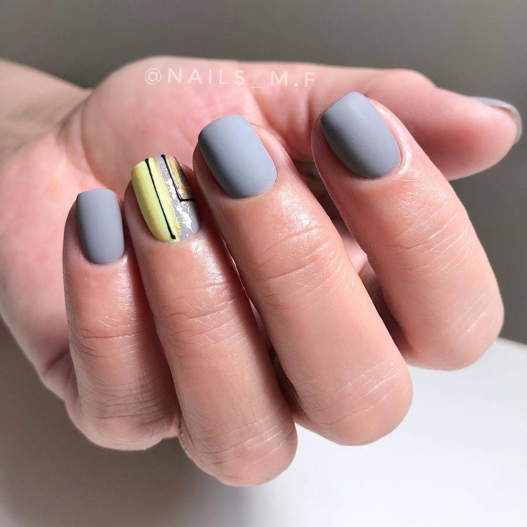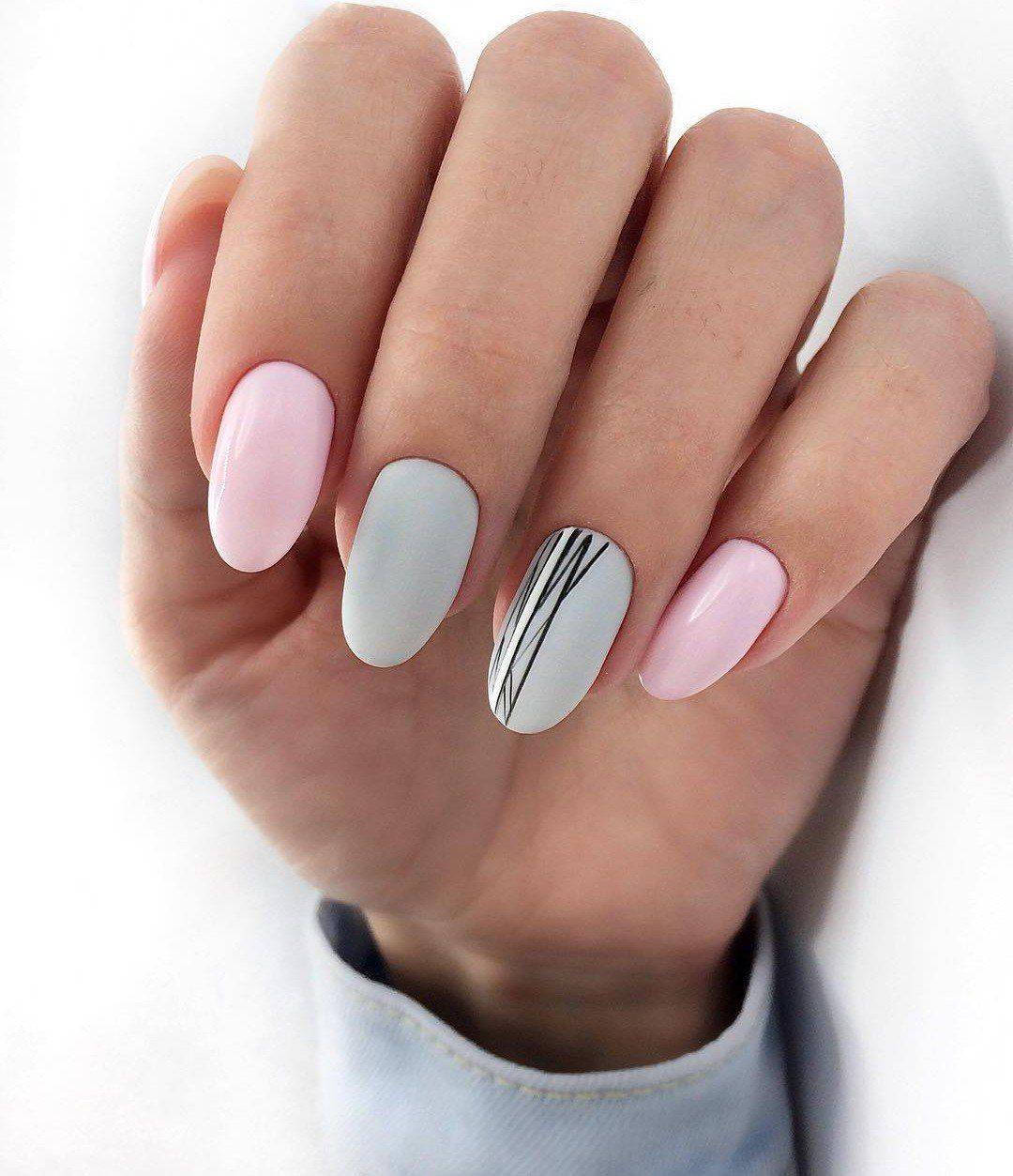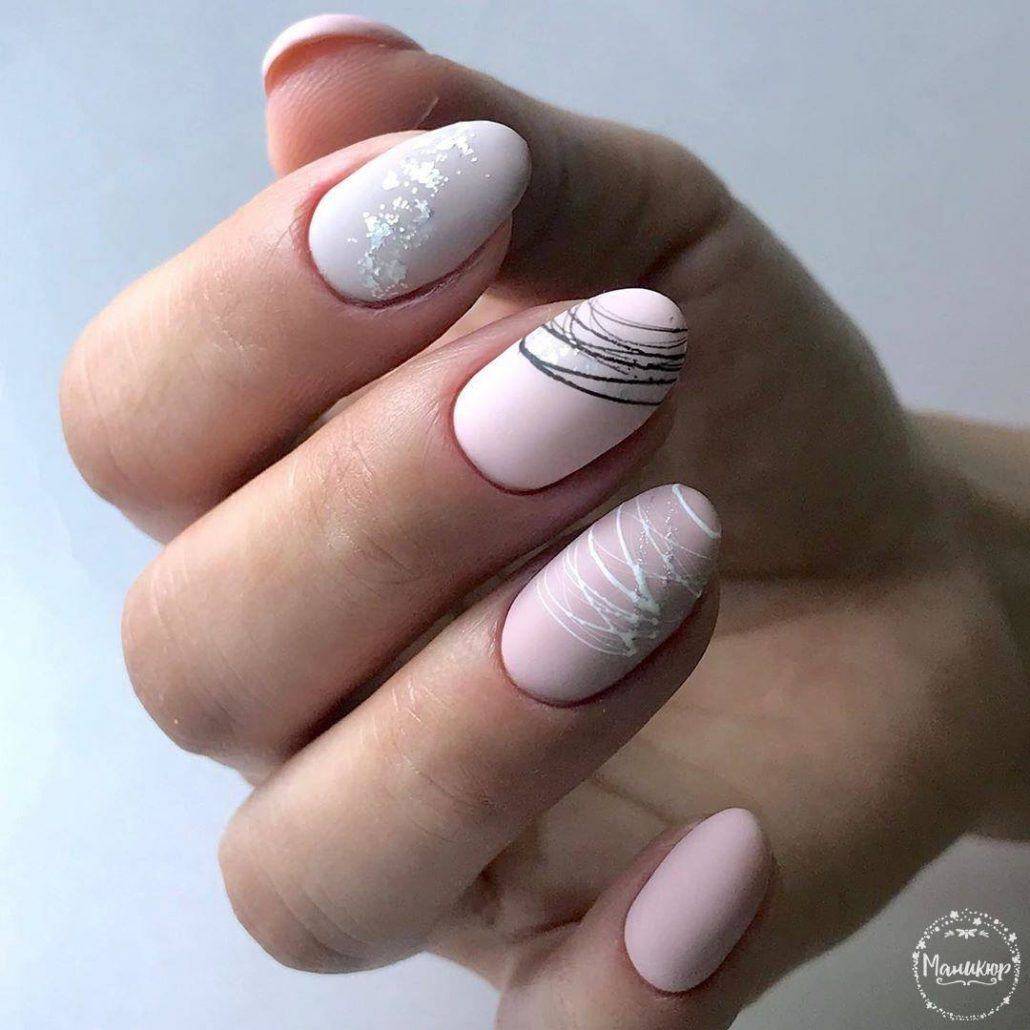 Матовые серо-голубые, голубые, бежевые или пудровые цвета и пара легких геометрических рисунков на разных ногтях – вот и лаконичный, стильный деловой нейл-арт.