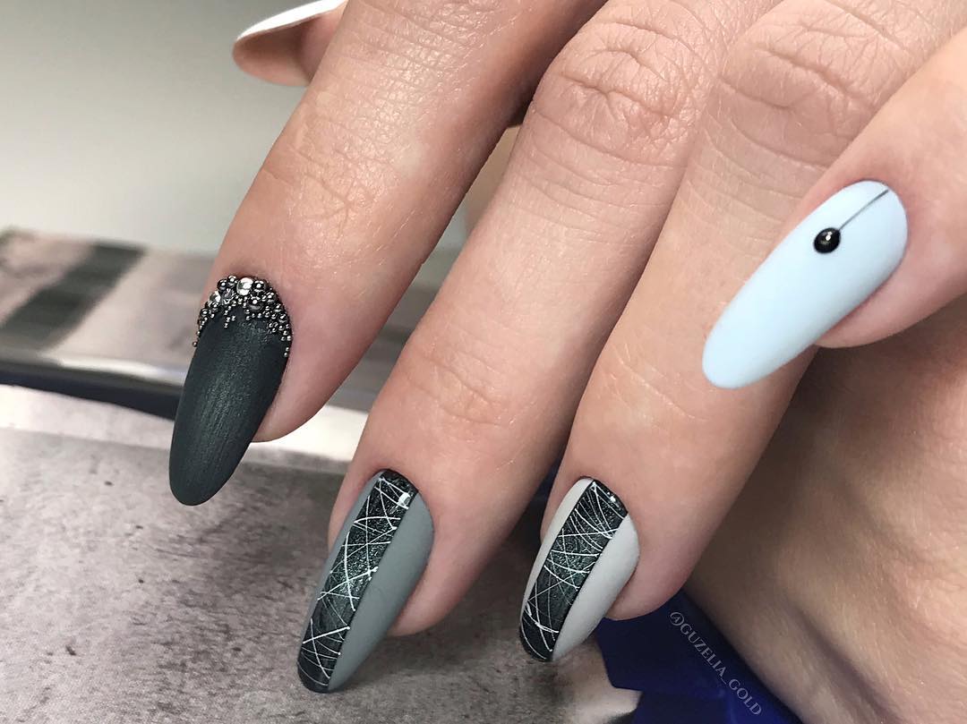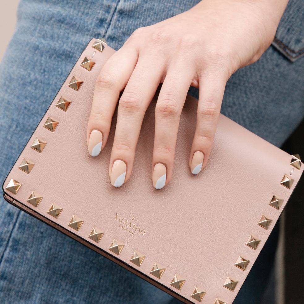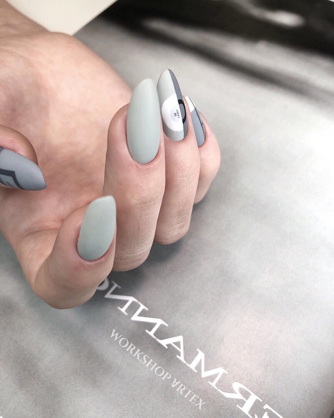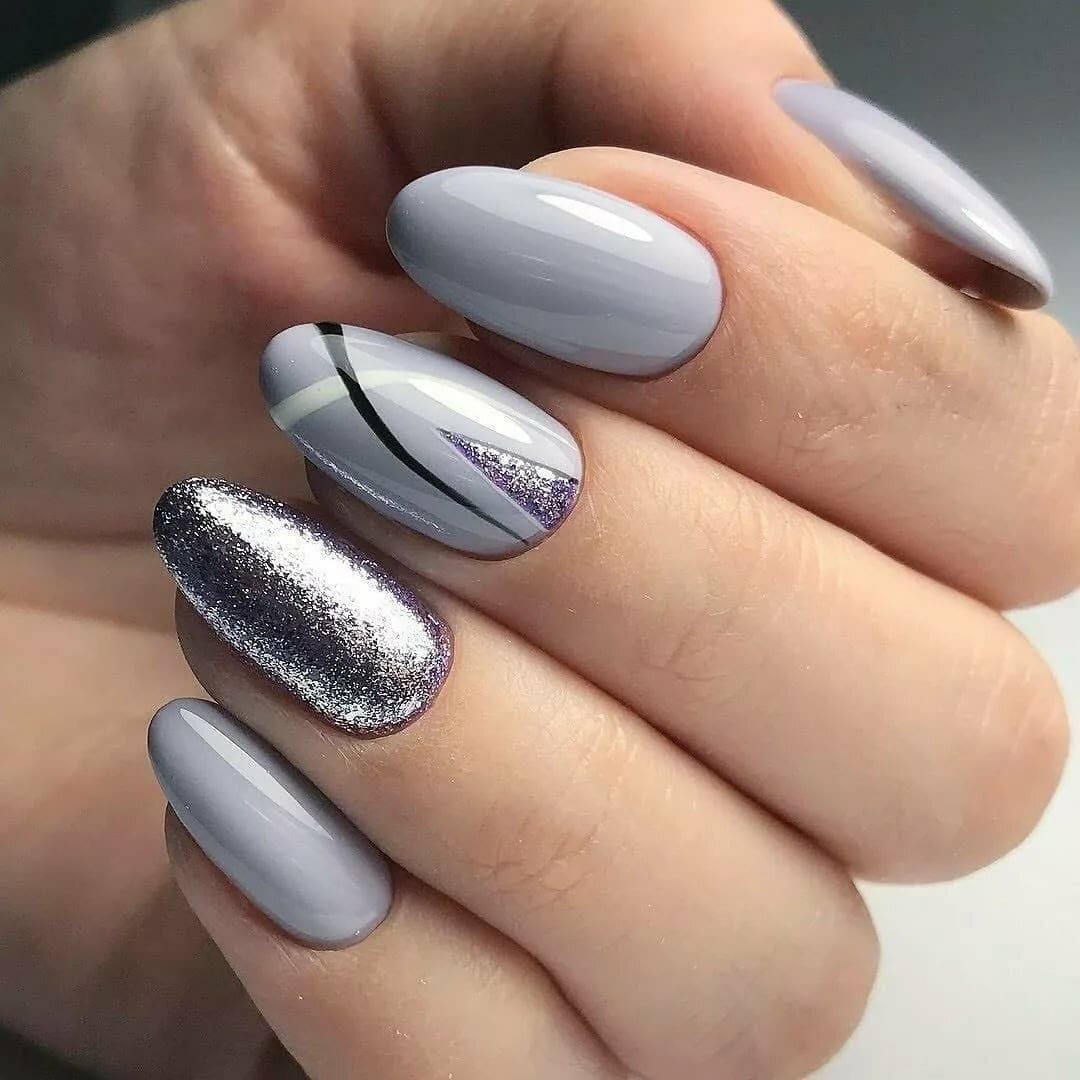 Матовые серо-голубые, голубые, бежевые или пудровые цвета и пара легких геометрических рисунков на разных ногтях – вот и лаконичный, стильный деловой нейл-арт.