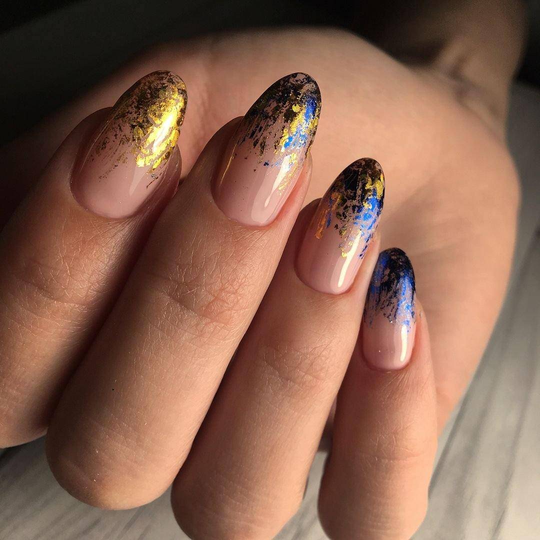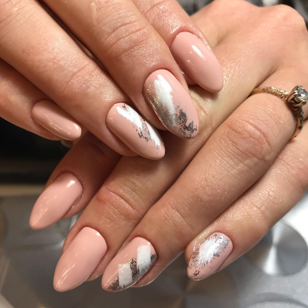 - дизайн с помощью фольги – на ногти наносится гель-лак, ноготь фиксируется фольгой, которую необходимо слегка подвигать по поверхности ноготка. В итоге должен получится нежный рисунок без заметных границ.