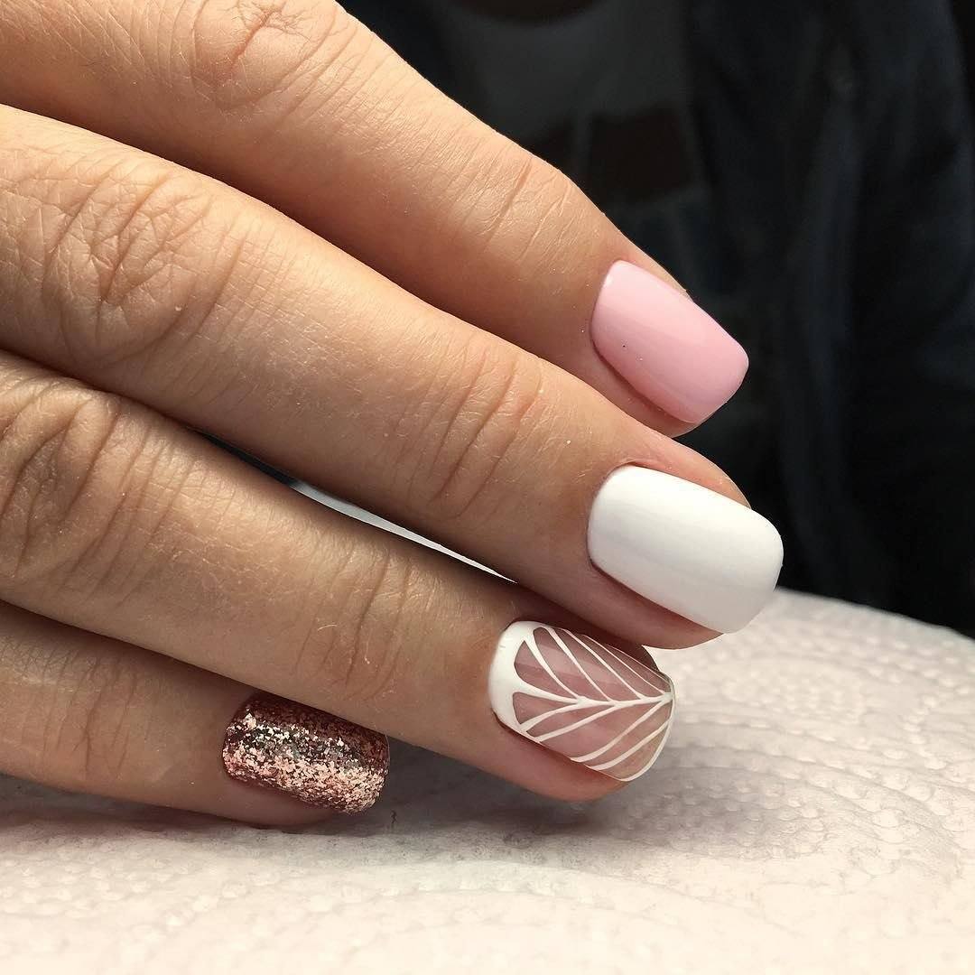 Можно сочетать в офисном маникюре сразу несколько спокойных цветов – белый, серый, темно-зеленый и розовый. Элементов дизайна также может быть несколько – стразы, фольгированная лента, мрамор.