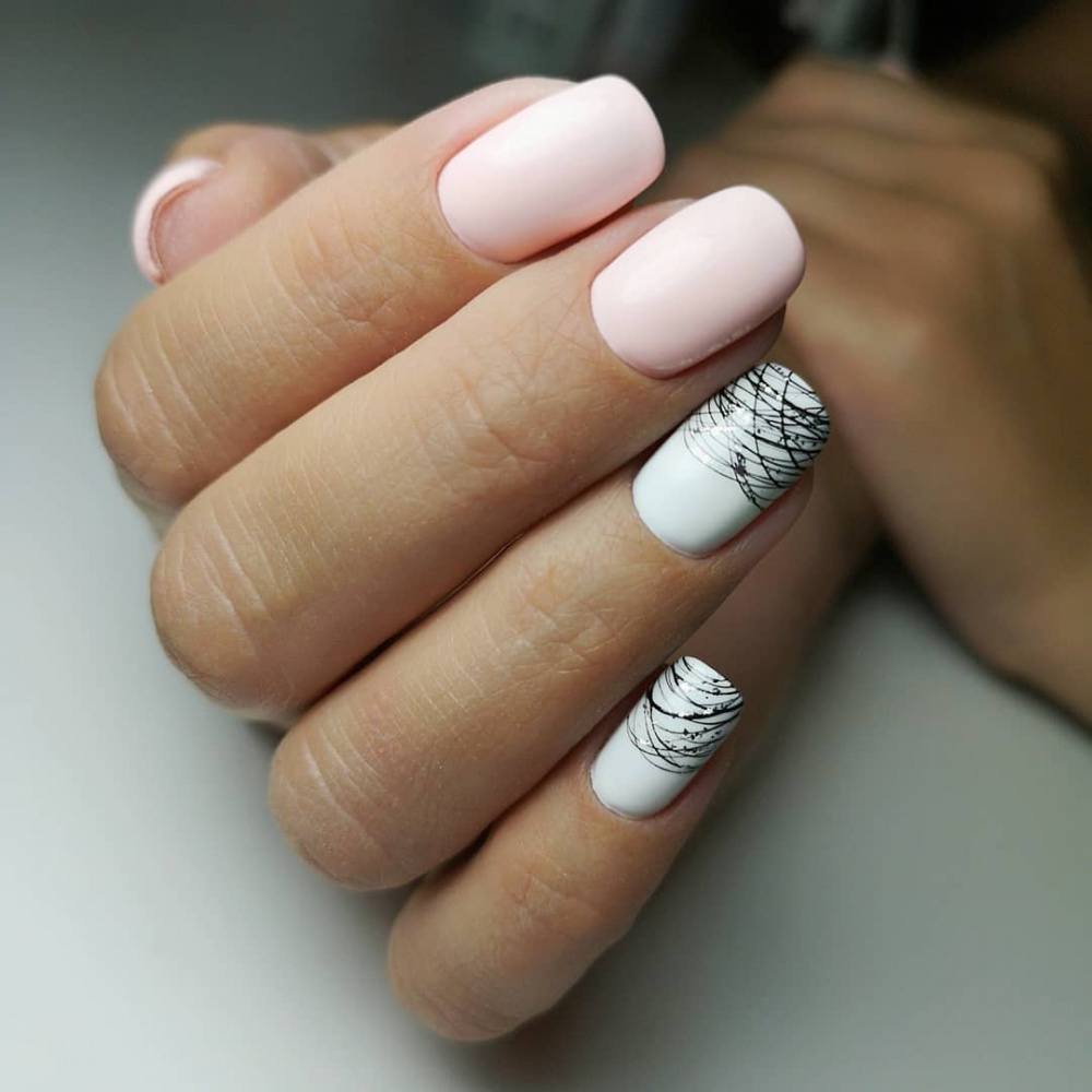 Важно! Сегодня особой популярностью пользуется монохромный дизайн маникюра, в котором чередуется матовое и глянцевое топовое покрытие, образуя на поверхности ногтя оригинальные витиеватые узоры.