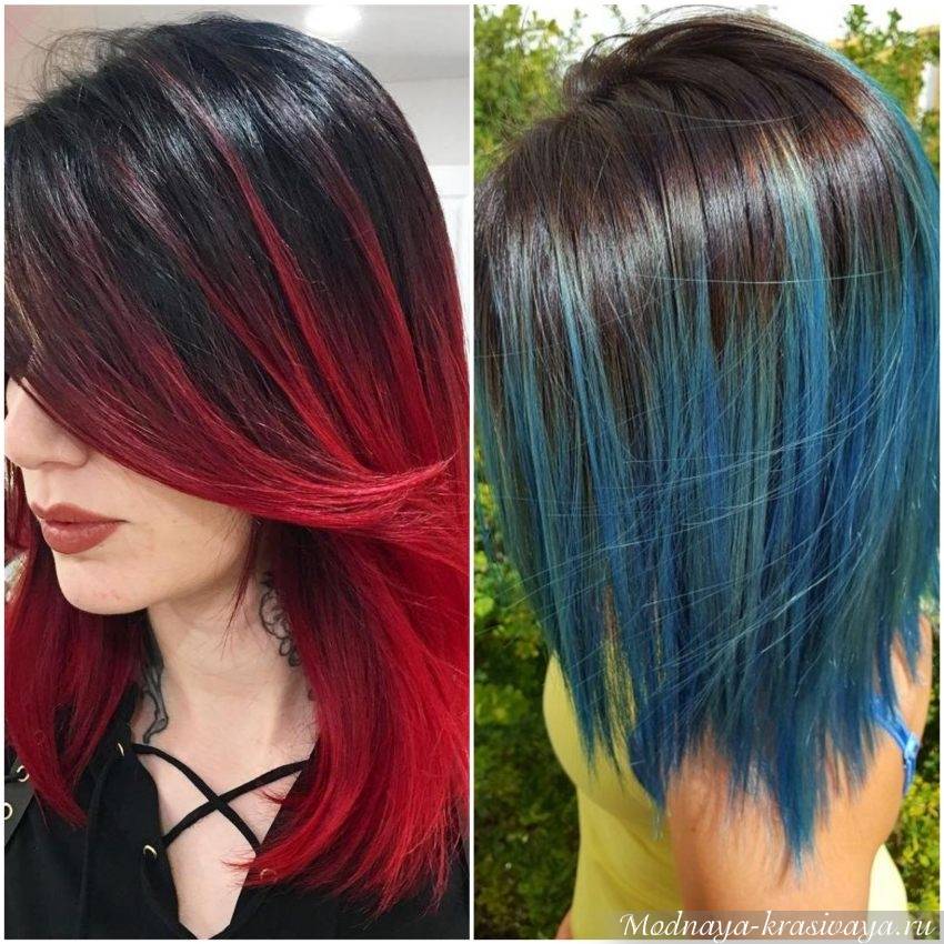 Черноволосым и темноволосым красавицам можно всё! Красные, зеленые, синие и выбеленные концы волос воплощают в себе бунтарский и дерзкий дух. Цветные пряди сразу выделят владелицу шевелюры из толпы, что вызовет всплеск стихийных стрит-фото. Хотите ли вы стать звездой соцсетей?! Если жажда популярности пока не проснулась в сердце, выбирайте более спокойные цвета. Шоколадные, коньячные, карамельные оттенки обогатят образ, сделают прическу роскошной и элегантной.