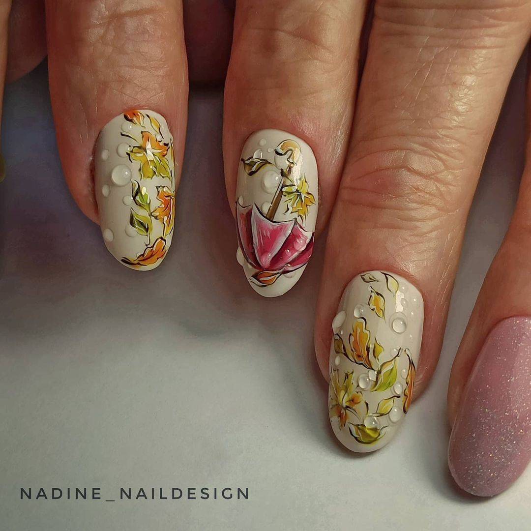 Поскольку осенний период всегда характеризуется дождливой погодой, а зонт является неотъемлемым атрибутом многих женских образов, то дизайнеры предлагают использовать эту особенность для создания стильного маникюра, в результате чего может получиться один из вариантов модного нейл-арта с тематическим рисунком. Особенно красиво смотрятся различные изображения зонтов в сочетании с каплями дождя, которые могут наноситься на основание ногтя при помощи той же техники, что и сам зонт, а могут быть сделаны из прозрачного акрила, и смотреться, как «настоящие». Используйте в качестве основы для таких «дождливых» рисунков плавные переходы градиента, которые в сочетании с прозрачными каплями будут смотреться особенно красиво или матовый топ