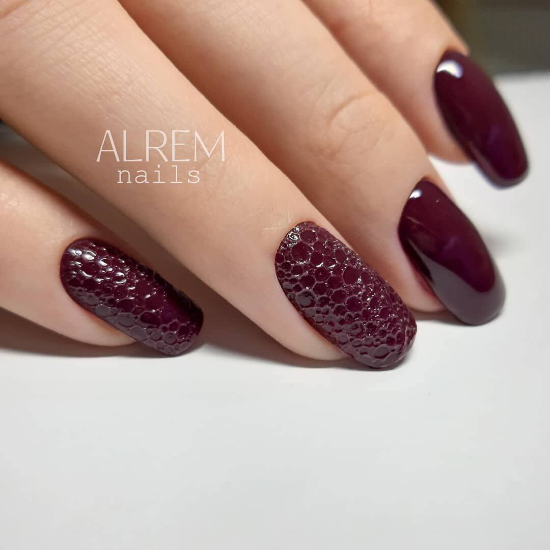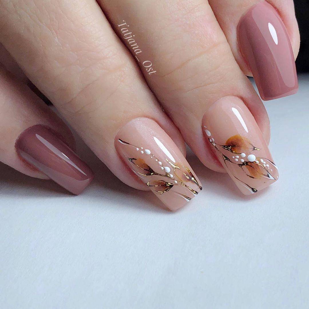 Эти благородные оттенки лучше всего оставлять «чистыми», не смешивая с другими цветами. Например, однотонное матовое покрытие, лунный маникюр или цветной французский маникюр. Если уж очень хочется рисунок на ногтях, то лучше декорировать один ноготок с помощью аппликации или росписи на осеннюю тематику.