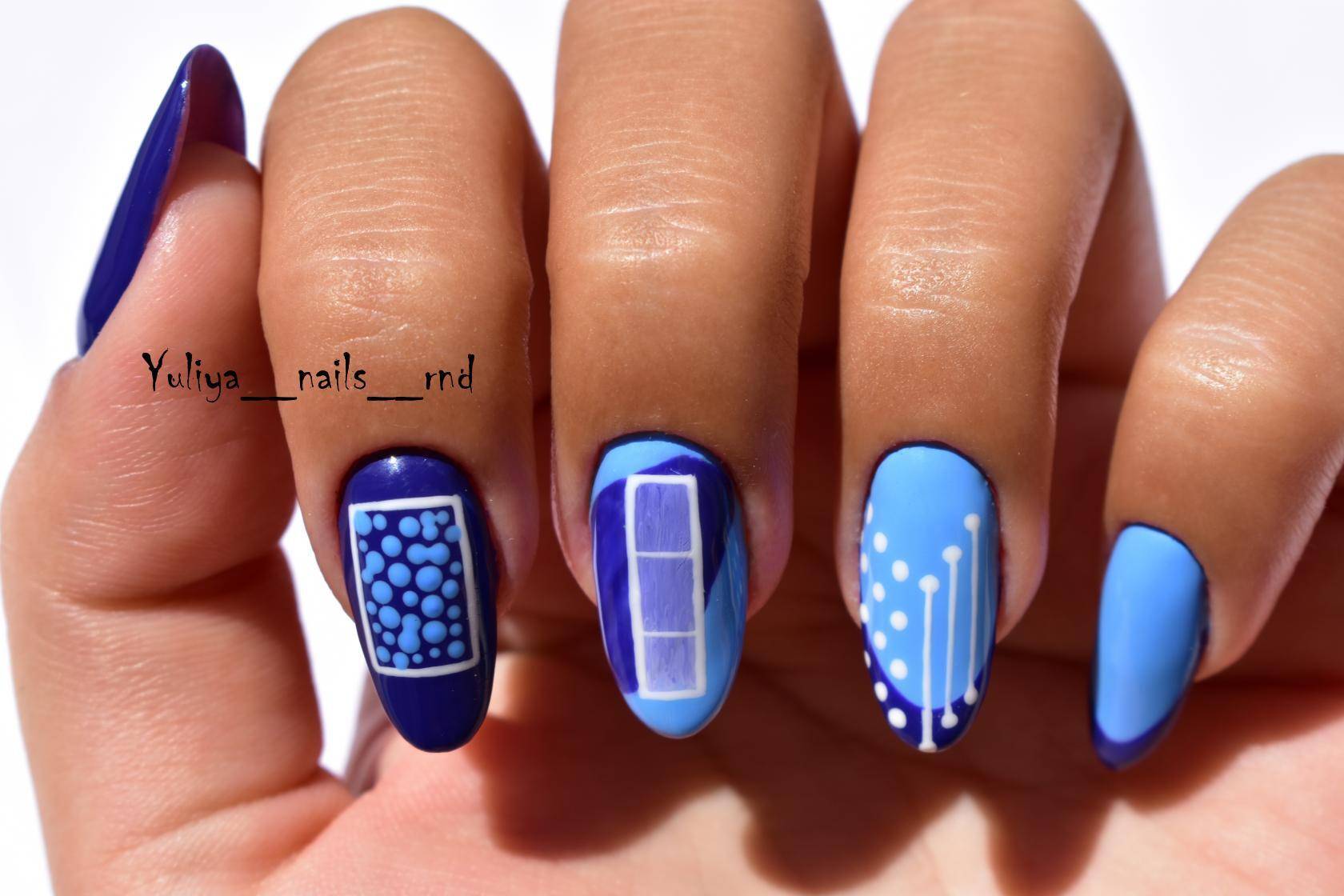 - Синий наряд не терпит маникюра в тон. Здесь нужен серебряный, серый, черно-белый вариант. Желтый, золотой, красный – в комбинированном исполнении.