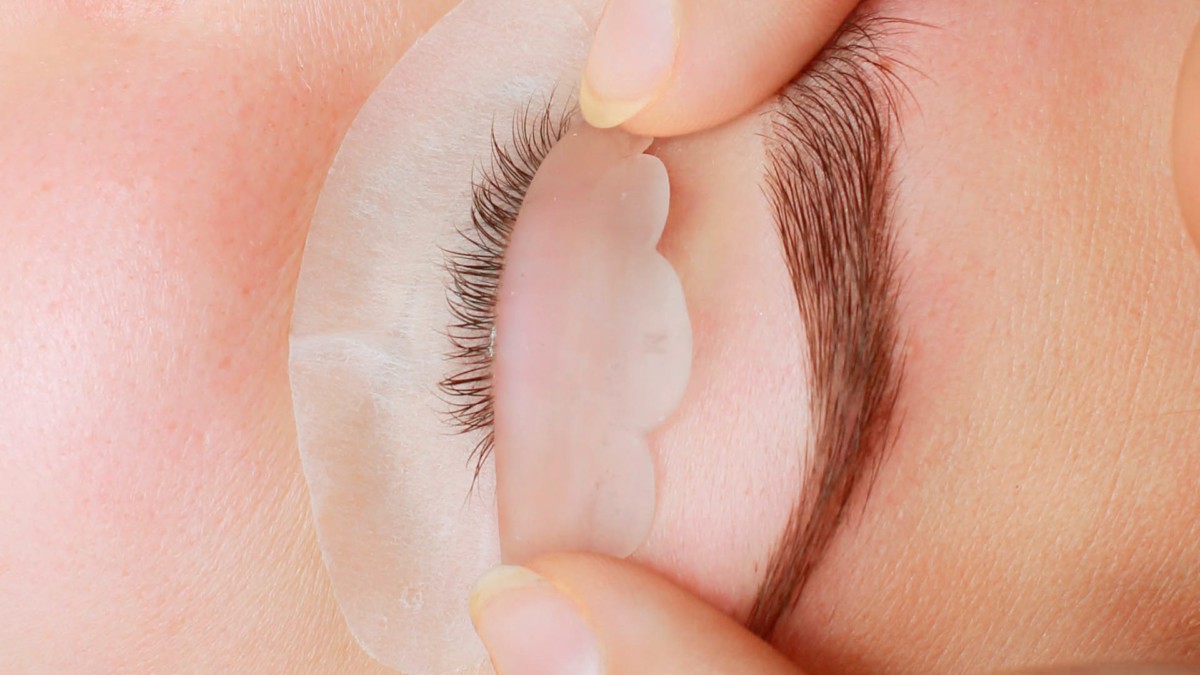 - Нижние веки защищают при помощи патчей. Подбирают бигуди для создания завитка. Волоски укладывают на валики и обрабатывают специальным препаратом для завивки.