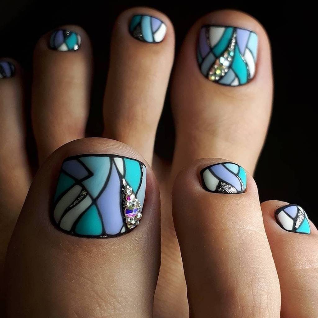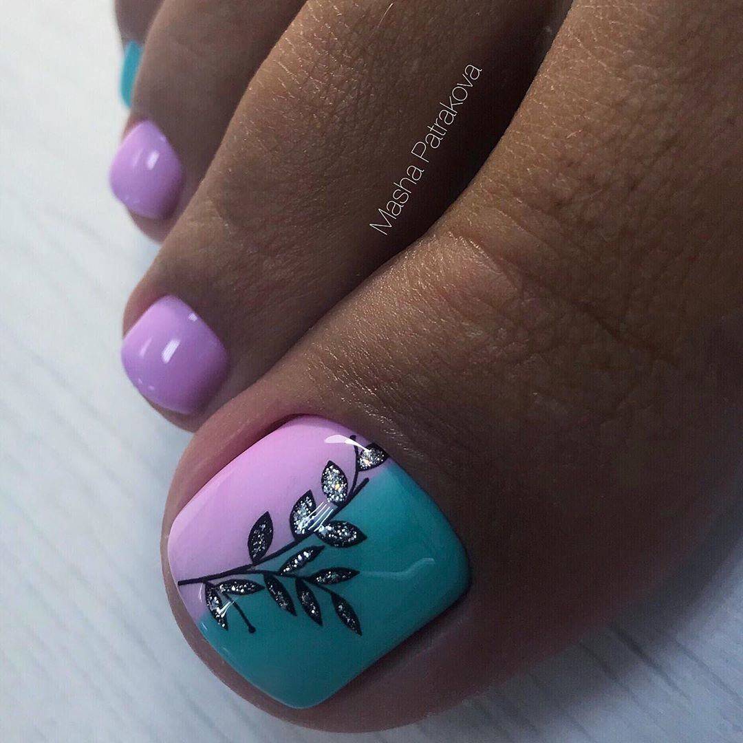 Такая идея оформления предполагает использование в педикюре пастельных оттенков. Голубой может красиво выделять акцентом только большой палец или принимать участие в создании всего педикюра. Дуэт розового и голубого очень красиво смотрится в плавных переходах градиента, геометрическом дизайне или элементах абстракции. В оформлении подобной идеи также можно дополнительно использовать другие оттенки, актуальные для всего образа, и блестящие элементы декора.
