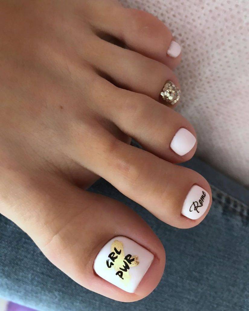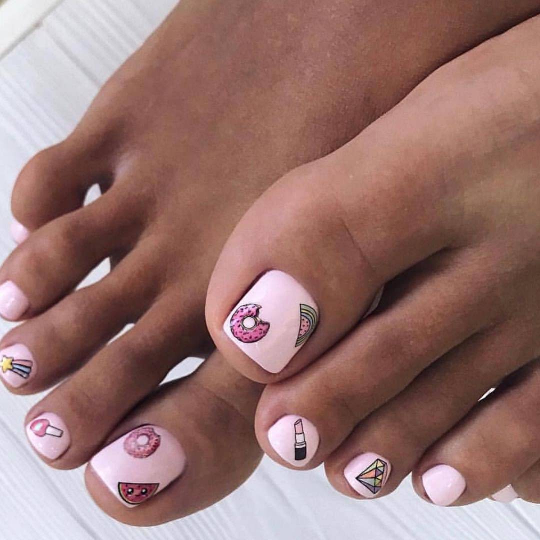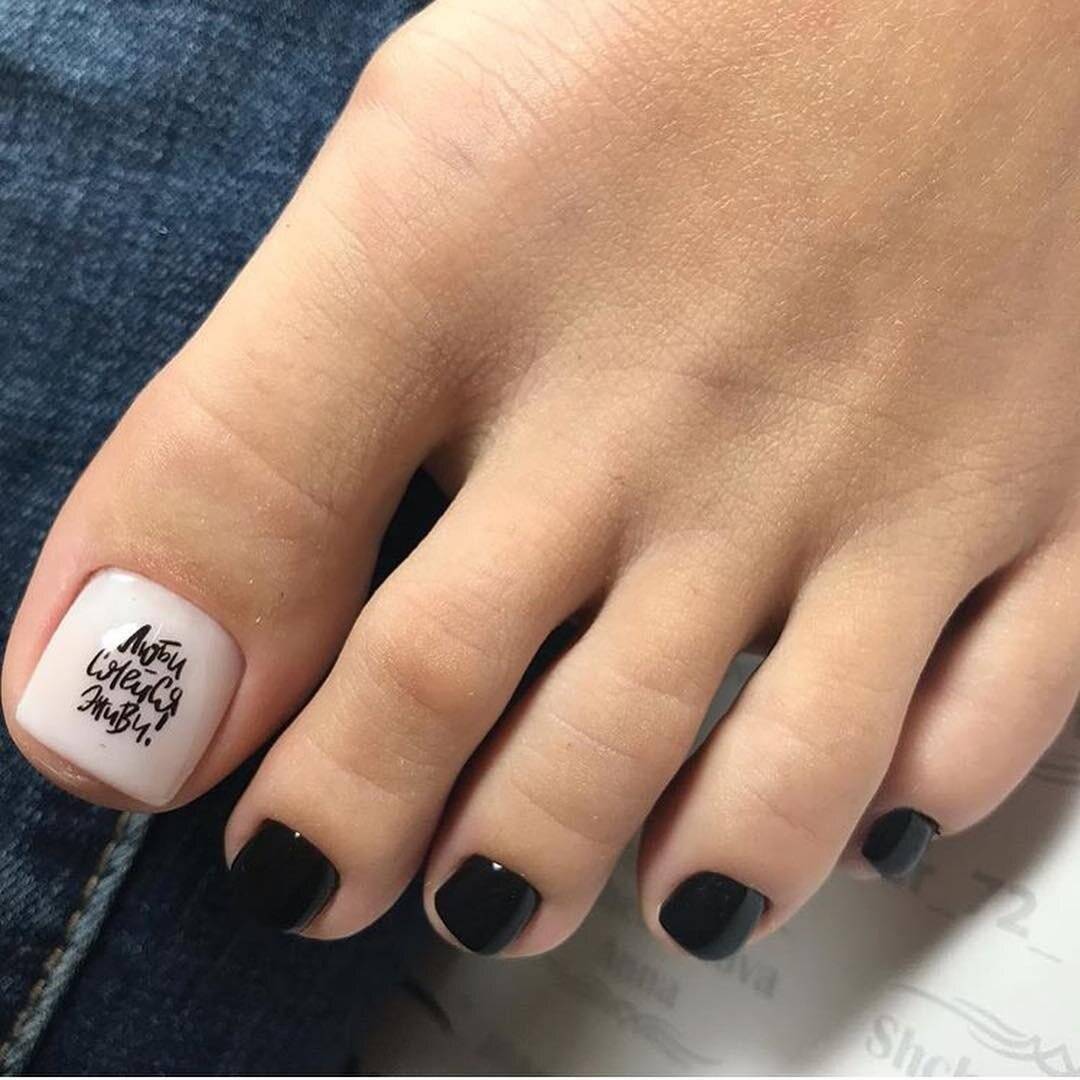 - рисунки – ногти на больших пальцах ног могут стать холстом для художника, в этом сезоне модными остаются рисунки в мультяшном стиле, надписи, примитивные силуэтные изображения, абстракция;