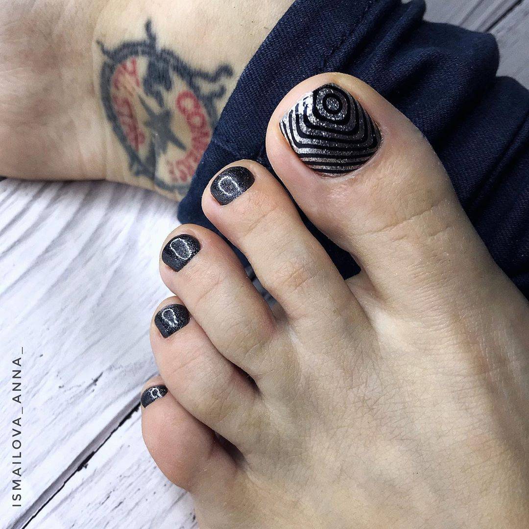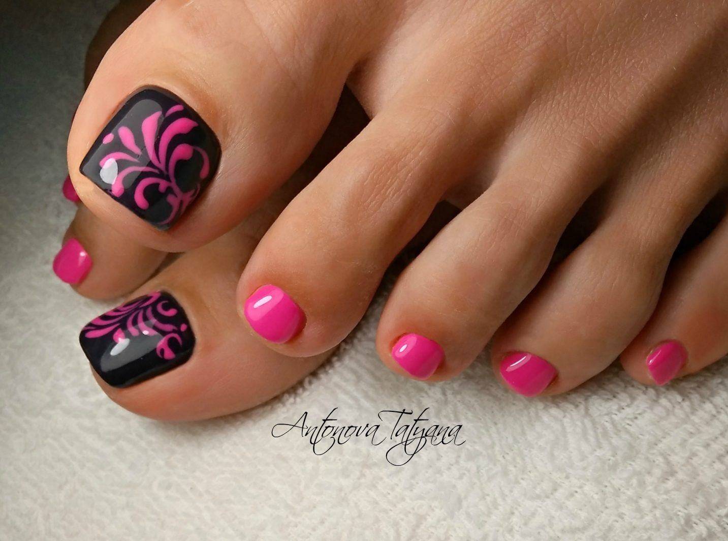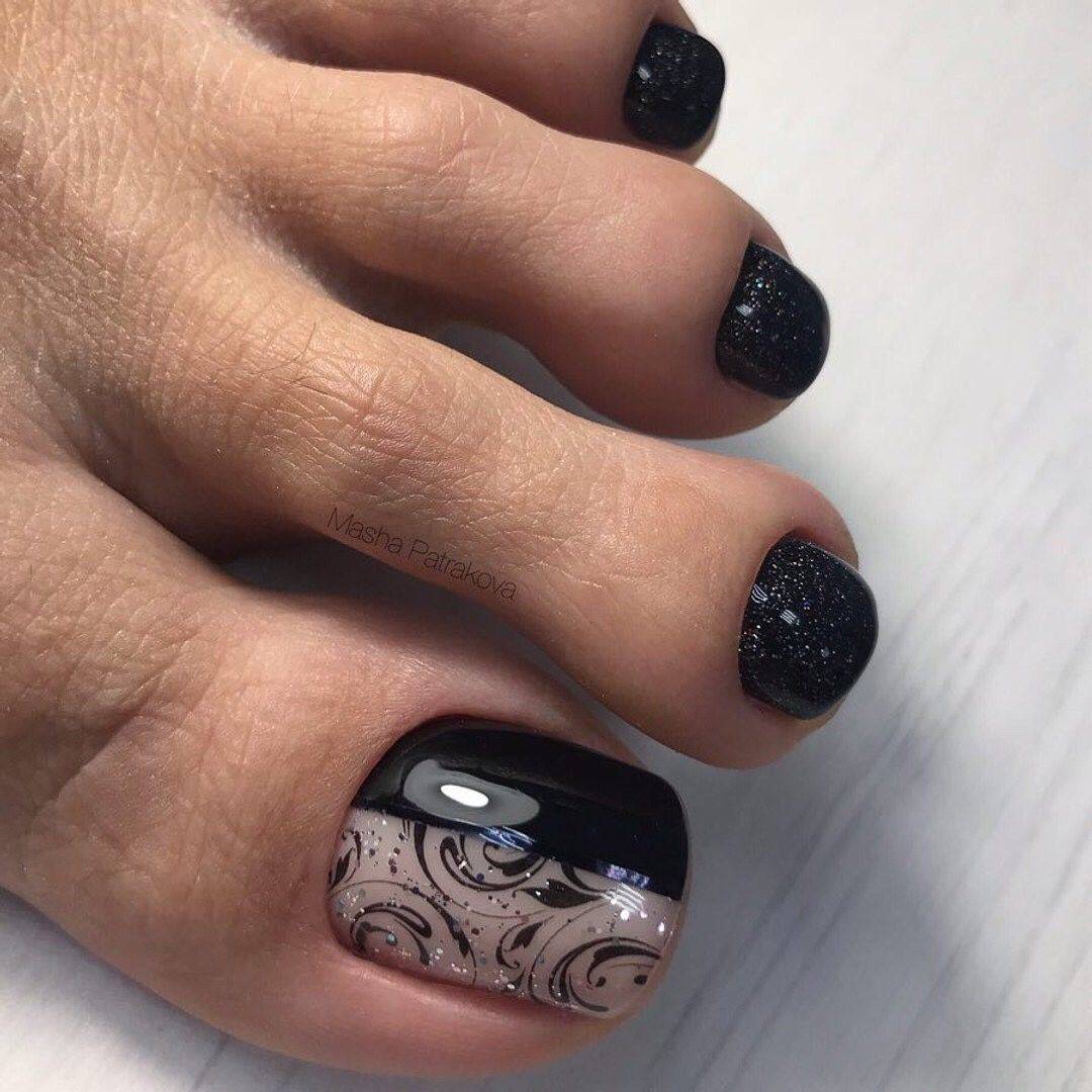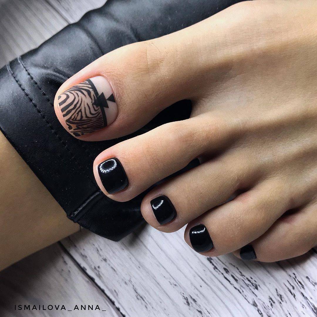 Добавление в дизайн педикюра чёрного цвета, позволяет максимально подчеркнуть тематику оформления, поэтому им можно смело прорисовывать детали рисунков, выделять границы между сочетаниями оттенков и использовать в небольших количествах для акцентирования части ногтевой пластины. Если вам кажется, что розово-чёрный дуэт смотрится немного мрачно, используйте при оформлении декор или оттенок, снижающий выраженную контрастность между покрытиями, например, белый. Не менее эффектно смотрятся в таком сочетании покрытия с содержанием блестящих частиц.