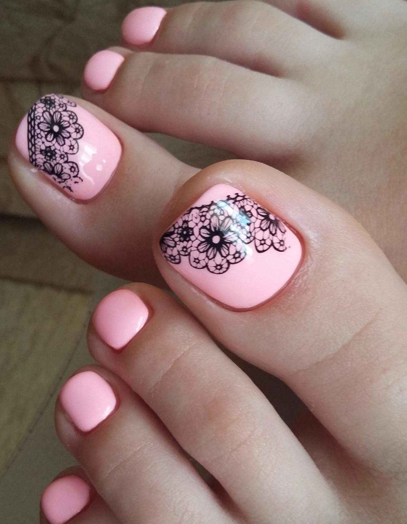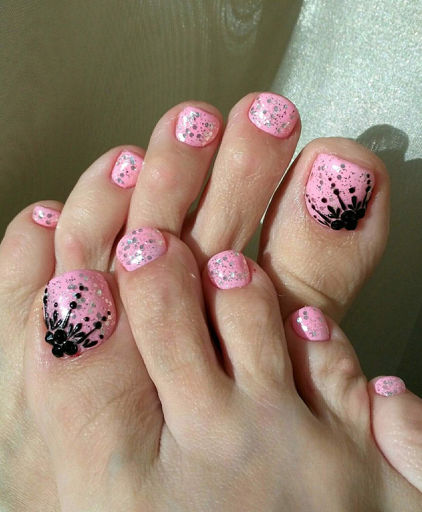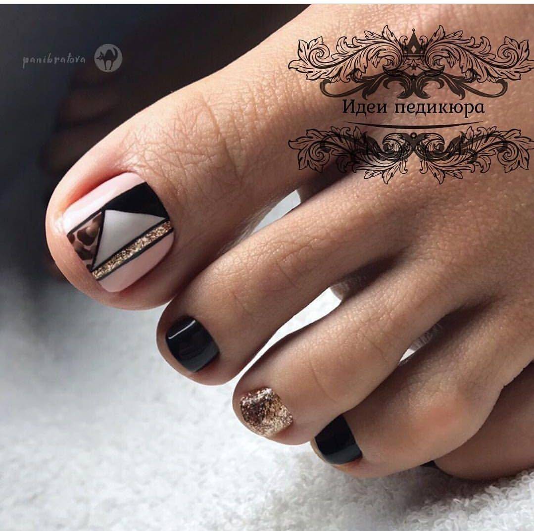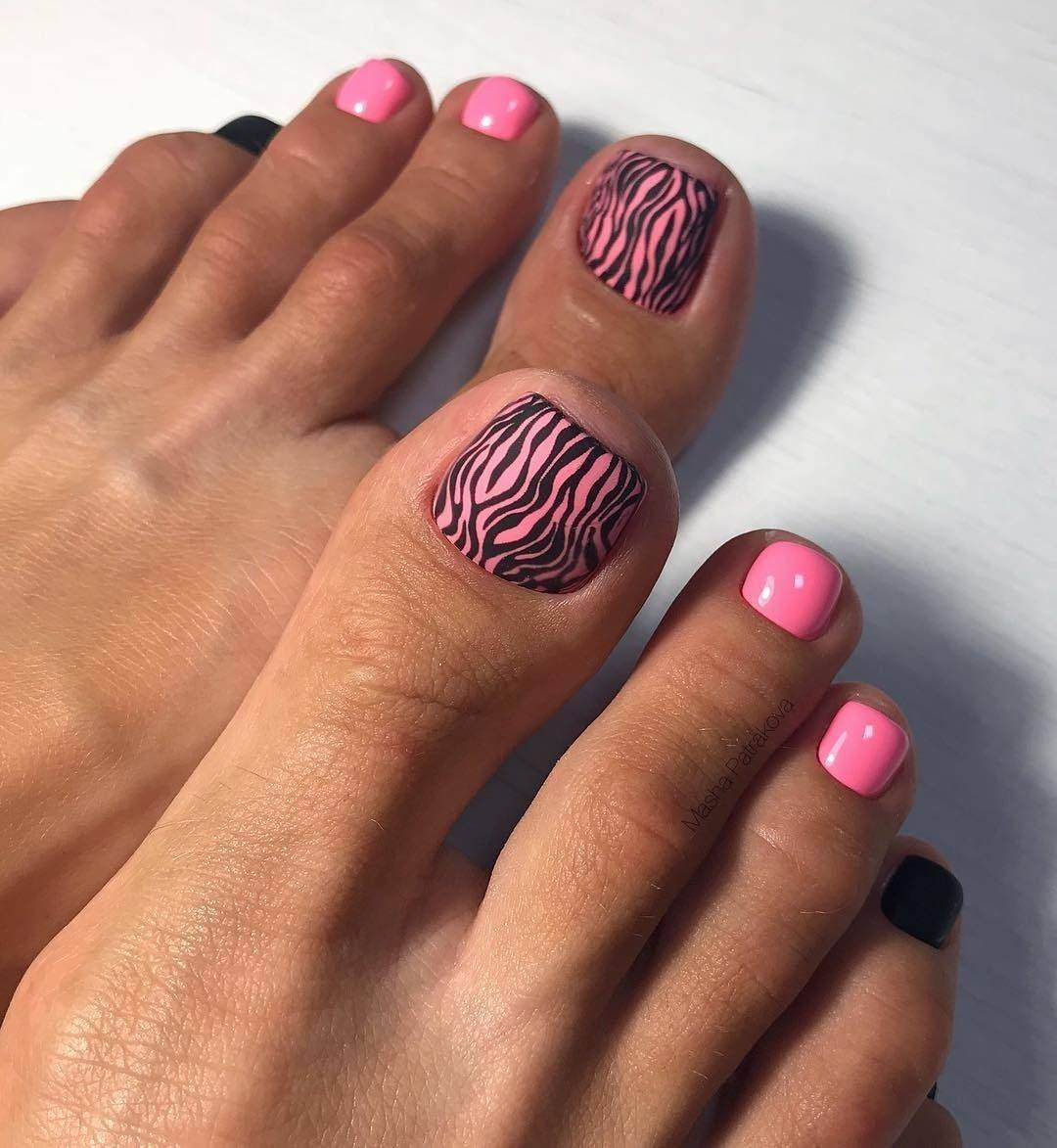 Добавление в дизайн педикюра чёрного цвета, позволяет максимально подчеркнуть тематику оформления, поэтому им можно смело прорисовывать детали рисунков, выделять границы между сочетаниями оттенков и использовать в небольших количествах для акцентирования части ногтевой пластины. Если вам кажется, что розово-чёрный дуэт смотрится немного мрачно, используйте при оформлении декор или оттенок, снижающий выраженную контрастность между покрытиями, например, белый. Не менее эффектно смотрятся в таком сочетании покрытия с содержанием блестящих частиц.
