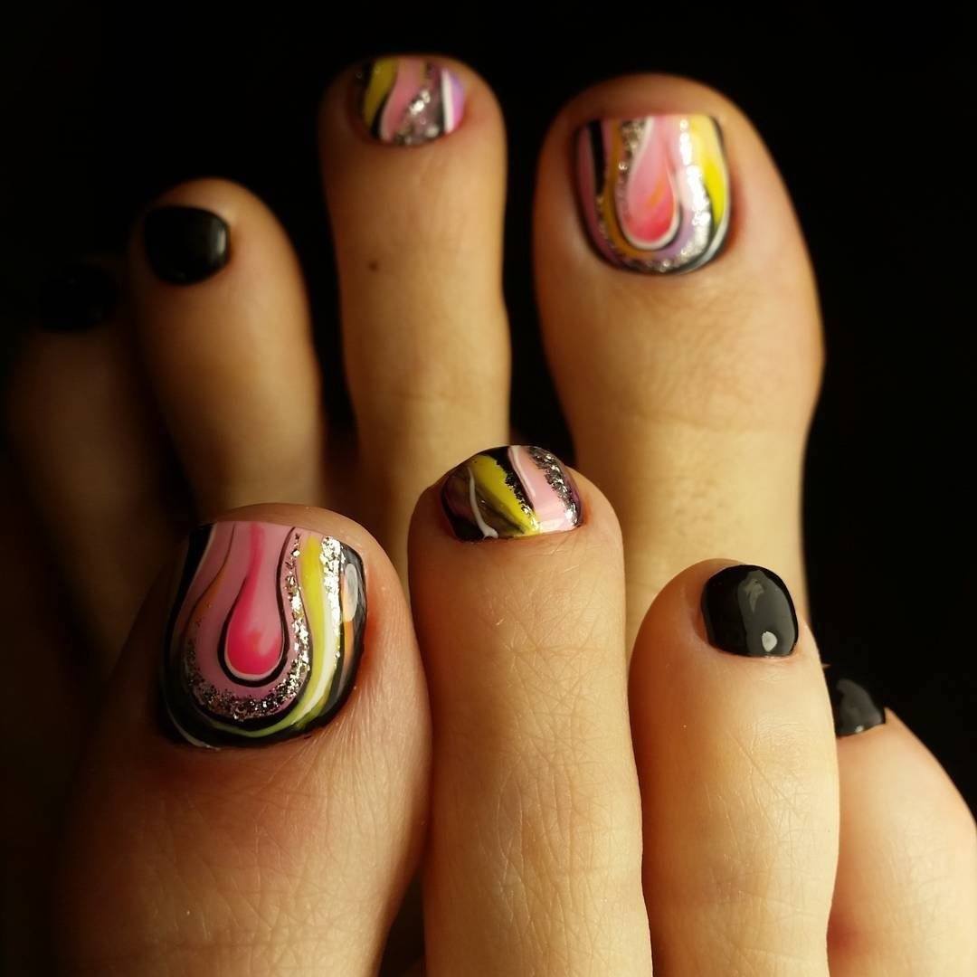 Абстракция. Педикюр с необычными и загадочными абстрактными рисунками будет очень популярен в будущем сезоне. Узор может напоминать причудливые разводы на воде или интересные цветы. Подойдет творческим личностям, которые ищут что-то новое и неординарное. Обязательно понравится подросткам и молодым девушкам.