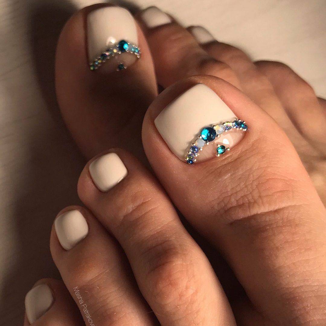 Украсить педикюр белого цвета можно мелкими камушками, стразами или рисунком с 3D эффектом.