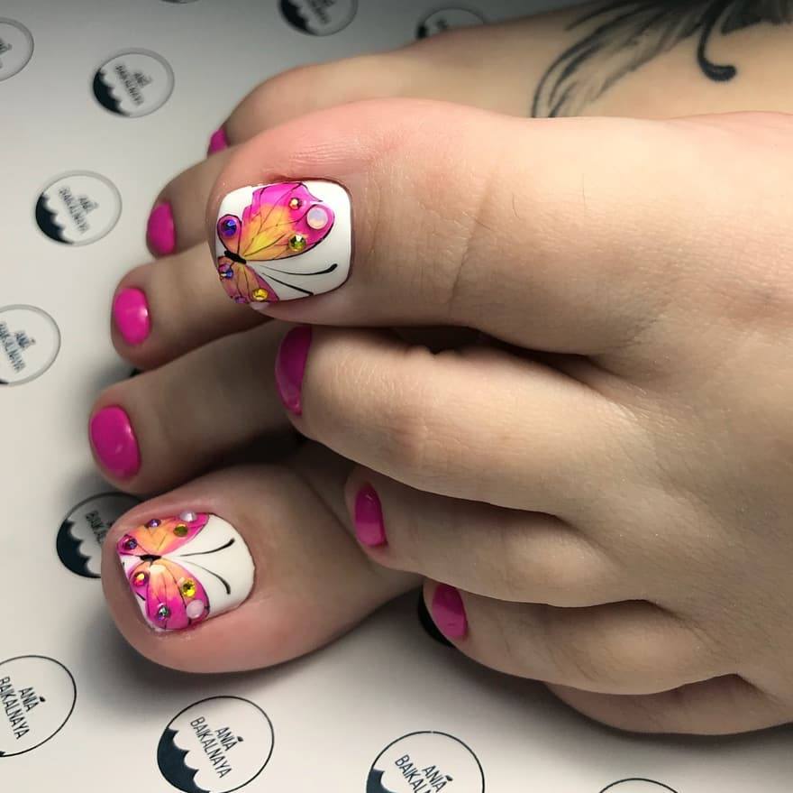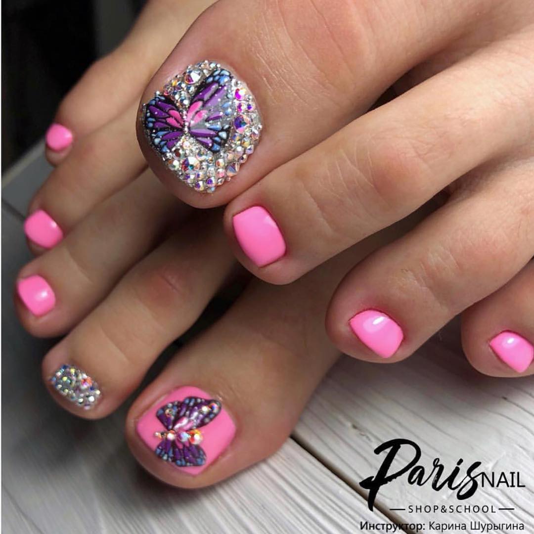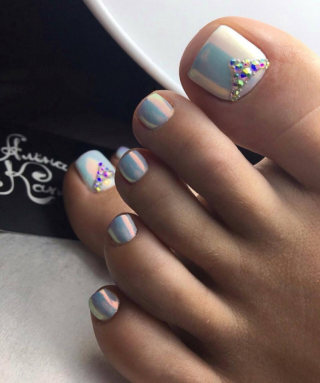 Если вы хотите покорить всех без исключения своим летним дизайном ногтей, то стоит обратить внимание на педикюр с добавлением различных стразов, камней, бульонок и хрустальных крошек.