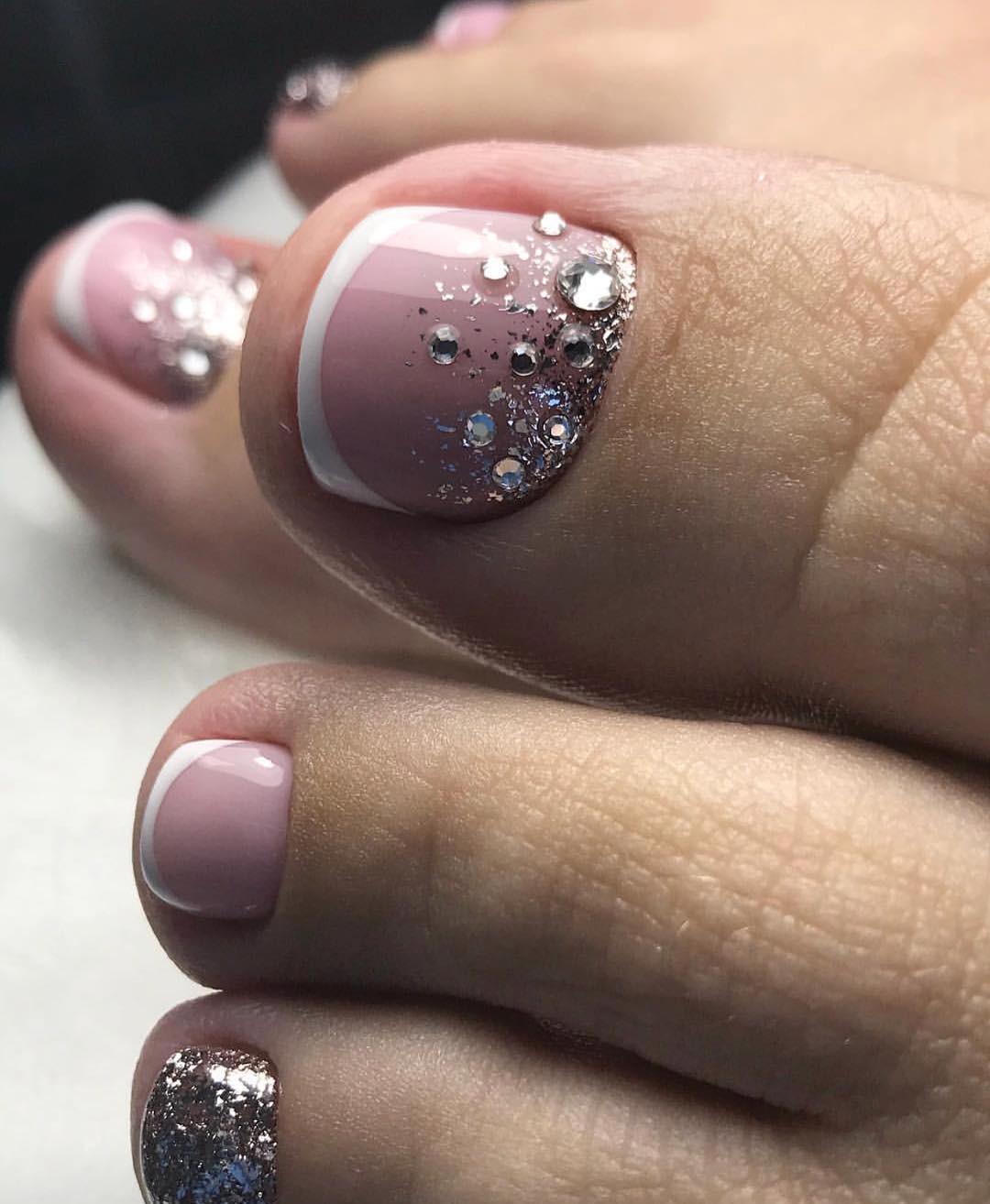 Сочетание в педикюре розового и серого характеризуется двумя направлениями. Нежный и спокойный дизайн оформляется гармоничным дуэтом холодного розового с аналогичным серым лаком. Тёплые оттенки палитр позволяют создать более яркий дизайн, и прекрасно подчеркнут детали образа или аксессуары. Покрытия могут оригинально чередоваться на всех пальцах или создавать красивый тандем на одном ноготке. Использование страз, бусин или глиттера в подобном примере только приветствуется.