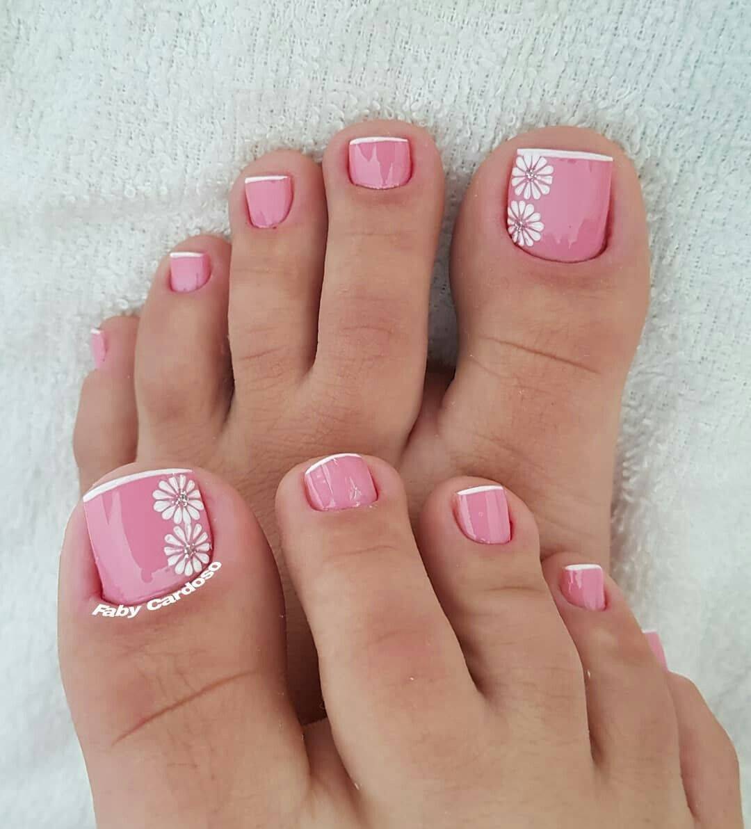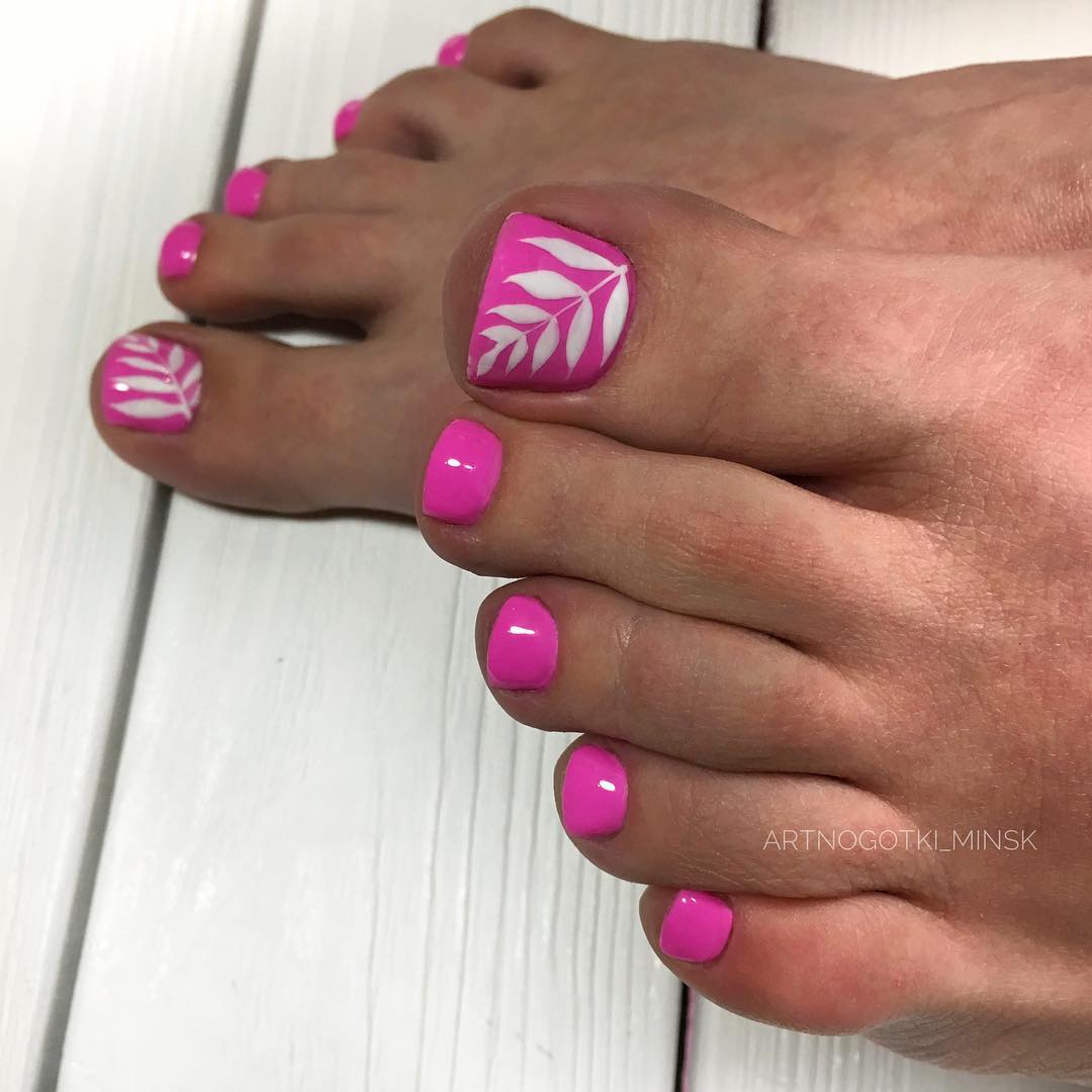 Сочетание розового с белым считается наиболее распространённым дуэтом в дизайне ногтей. Однако, для создания гармоничной композиции, дизайнеры советуют придерживаться некоторых правил. Если в педикюре используется яркий розовый оттенок, то дополнение белого следует свести к минимуму. При выполнении педикюра в светлой гамме основного покрытия, допускается его акцентное использование. Белое покрытие может выделять один ноготь на большом пальце и дополнительно украшаться декором из страз, блёстками глиттера либо рисунком. Также очень красиво смотрится розовый педикюр с белыми деталями, которые немного разбавят однотонность основного цвета и сделают дизайн более нежным.