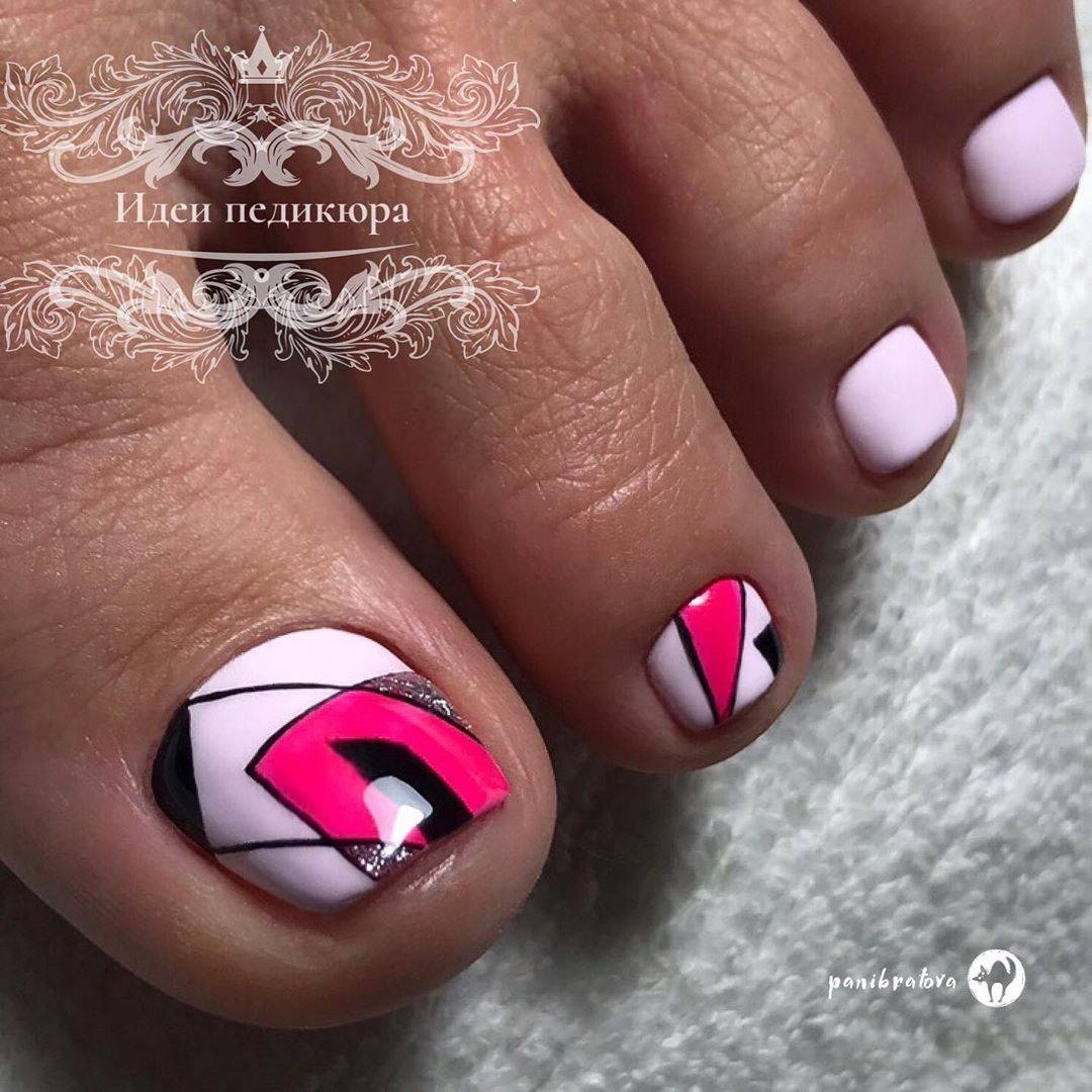 Геометрические узоры в педикюре с каждым годом склоняются все более к многоцветным и более абстрактным композициям. Линии, точки, углы и треугольники могут быть одинакового или разного размера и располагаться в строго определенном, либо хаотичном порядке. Такое нанесение отличается поистине шикарным дизайном и одинаково хорошо ложится как на глянцевый, так и на матовый лак.
