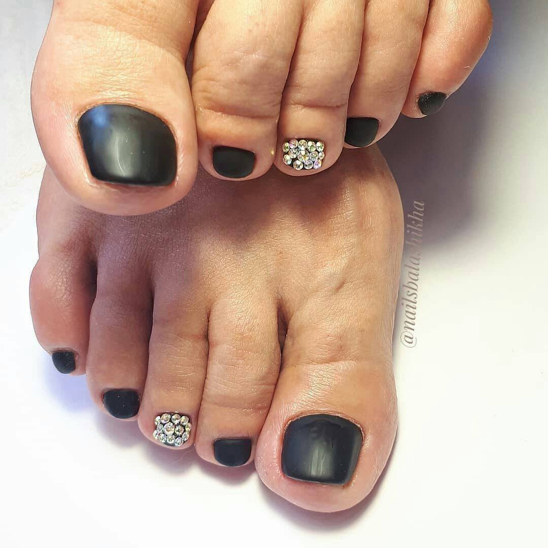 С использованием чёрного лака придумывают множество идей и сочетаний для педикюра. Он прекрасно сочетается со всеми цветами: белым, золотым, оранжевым и даже с неоновым.