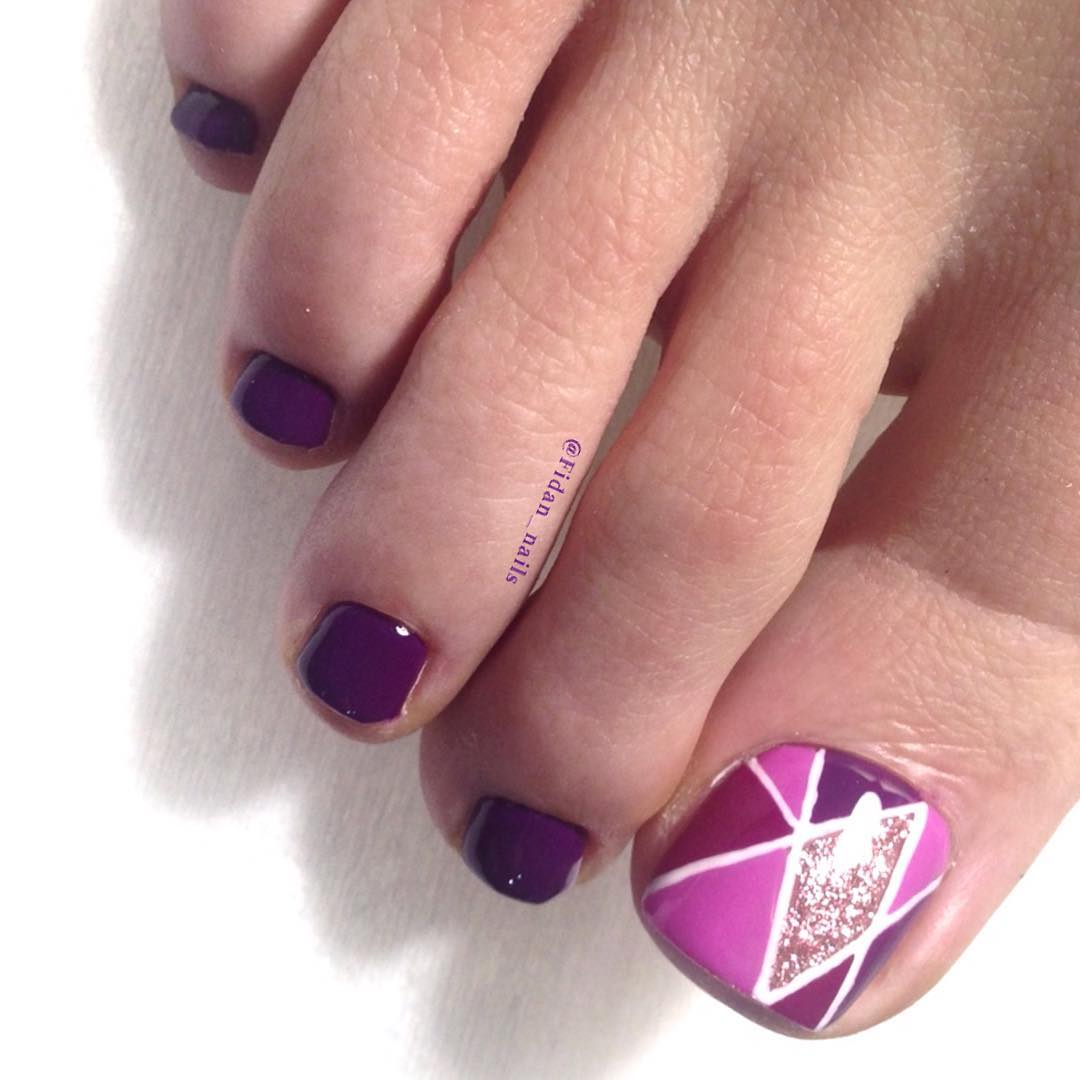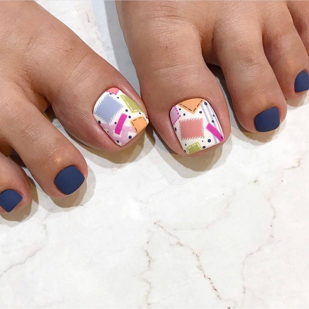 Color block. Ноготь делится на множество секторов, которые затем закрашиваются разными цветами. При желании в такой педикюр можно добавить немного блеска при помощи глиттера. Он будет выглядеть очень ярко и красочно, а также придаст образу игривости.