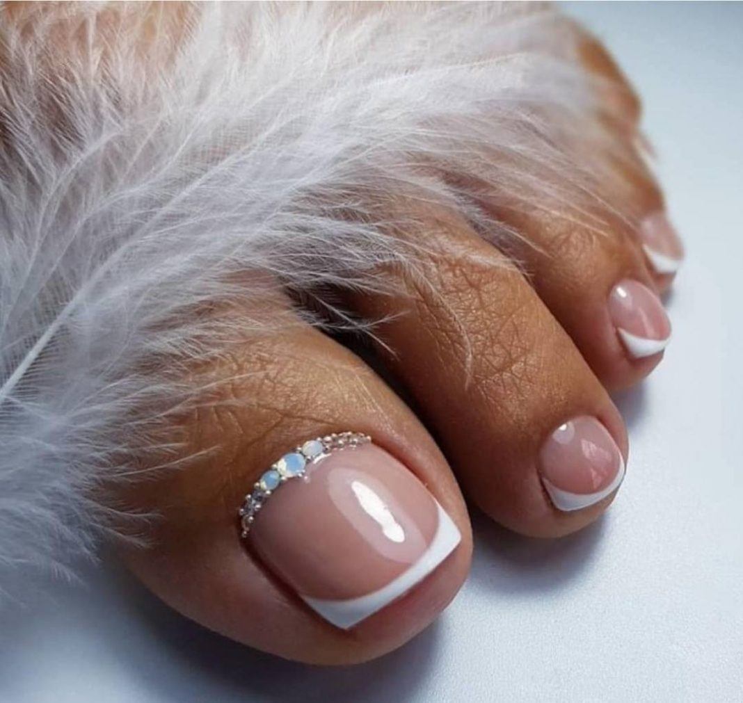 Нежно и изыскано смотрится сочетание стразов с французским педикюром, второе его название — френч. Такой вариант, представленный на фото подходит практически под все наряды.