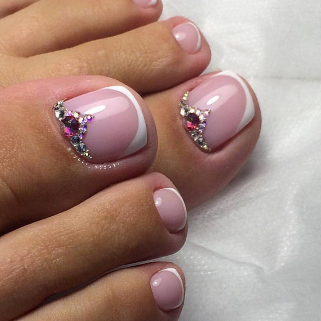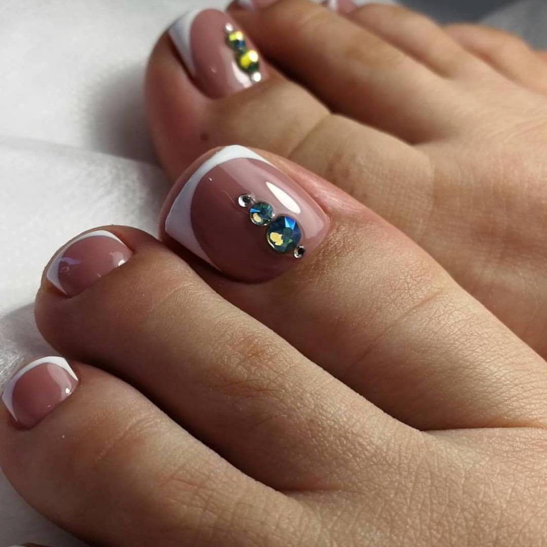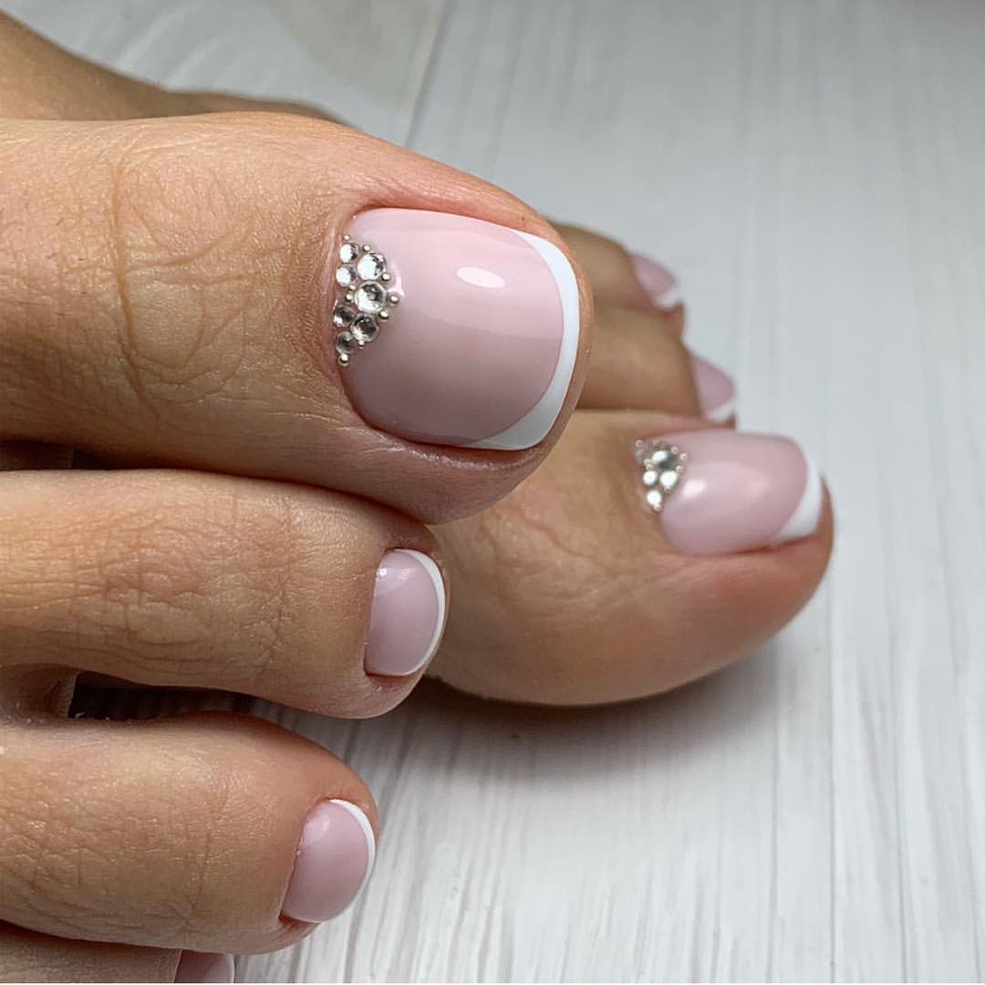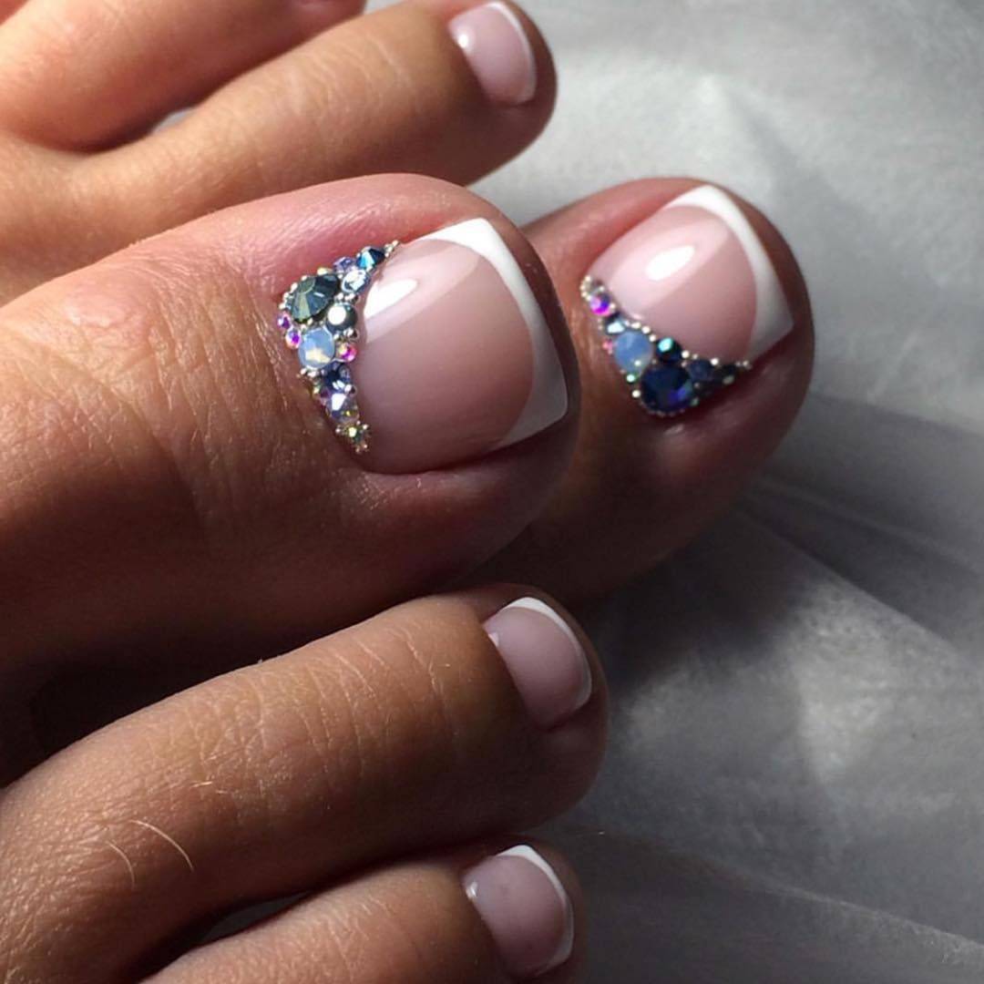 Френч все еще в моде и активно пользуется спросом у обладательниц прекрасного пола. Его можно разбавить глиттером, стразами, выделенными лунками, кристаллами. Тогда дизайн ногтей на ножках заиграет новыми красками.