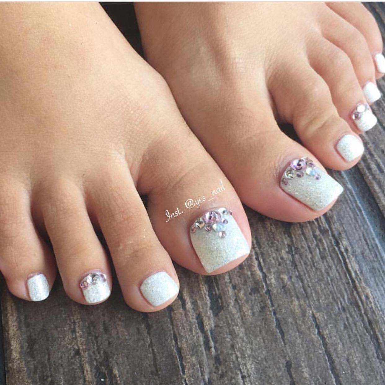 Шикарно смотрится на ножках аккуратный белый педикюр со стразами. Белый хорош в сочетании с различными цветами, поэтому с ним легко экспериментировать.