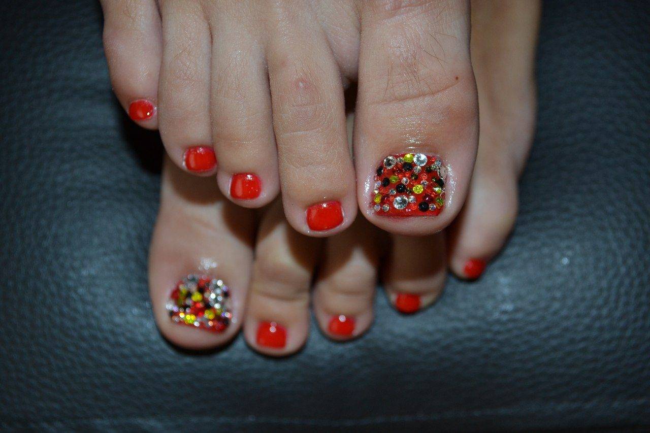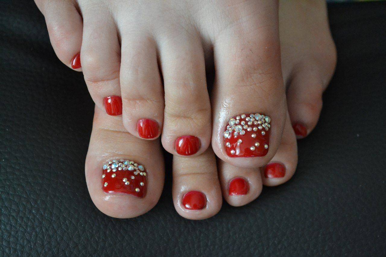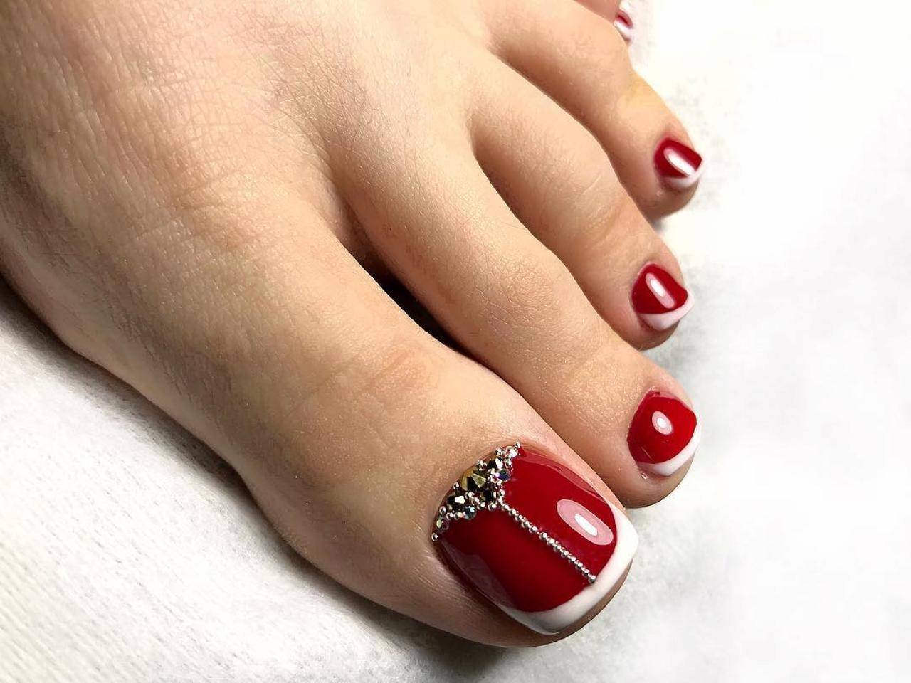 Красный педикюр со стразами смотрится ярко и эффектно, идеален для вечернего образа.