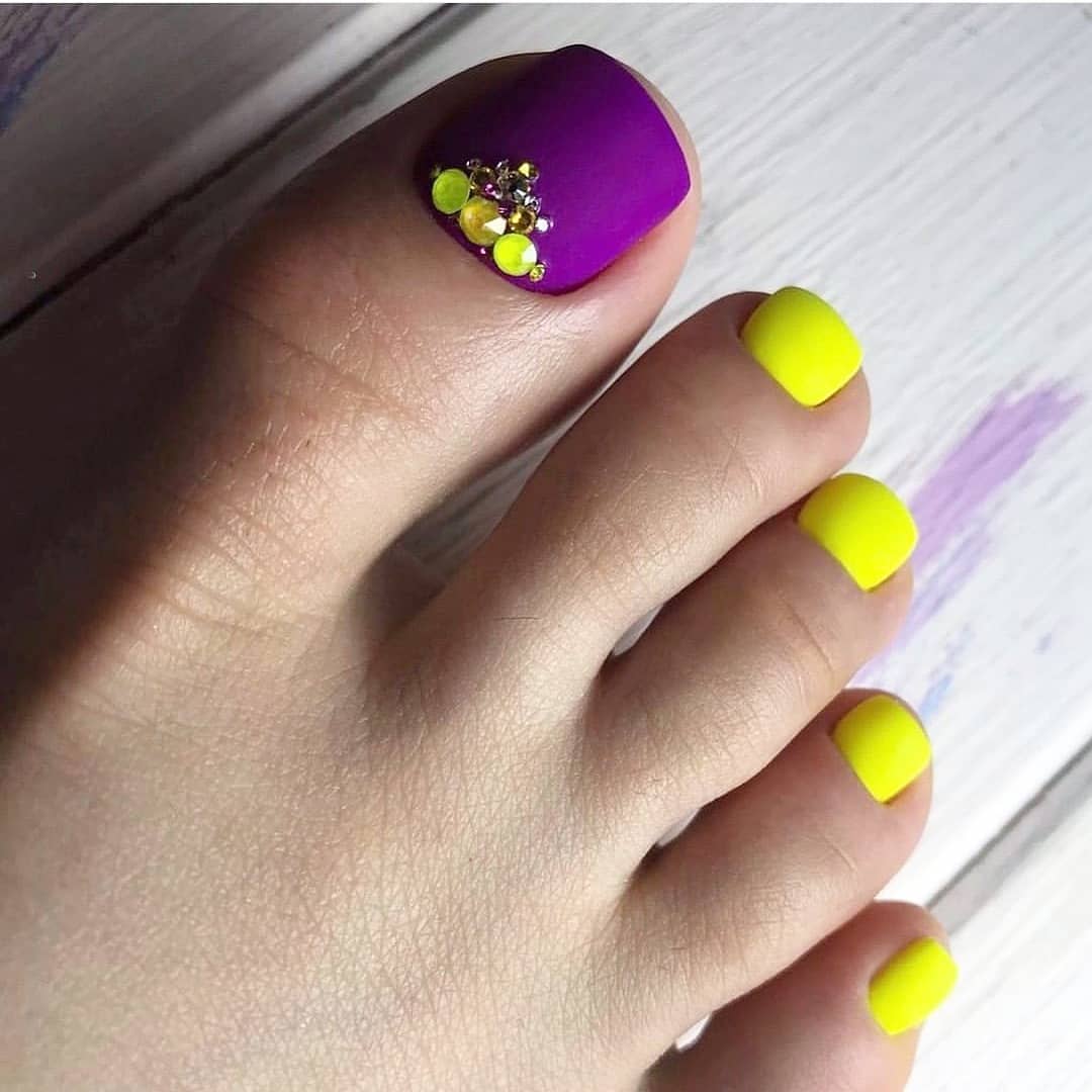 Популярность набирает сочетание разных оттенков в ярком дизайне. При чем цвета могут практически не подходить друг к другу — это, наоборот, делает педикюр необычным и оригинальным.