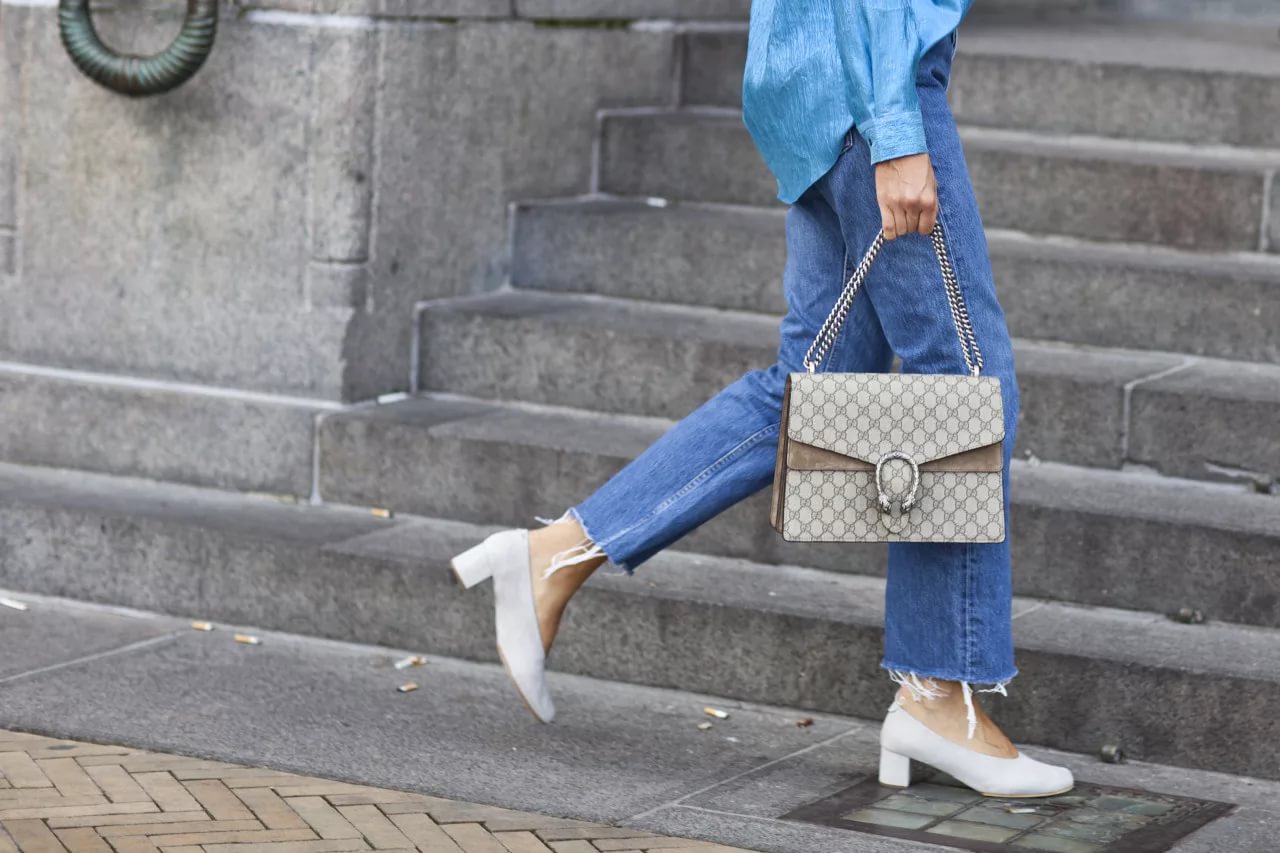 - Стрейчевые джинсы со средней посадкой идеально подчеркнут ноги и бедра. Низкую посадку в этом случае не стоит выбирать, иначе низ будет выглядеть грубым. Если есть торчащие бока, то линию талии сзади на штанах лучше приподнять, тогда их не будет видно.