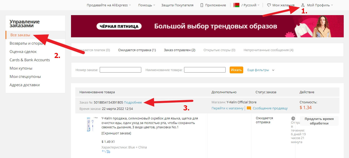 9. Статус заказа можно отследить в разделе «Профиль» (справа сверху) — «Заказы» (в меню слева) — как понять где находится посылка.