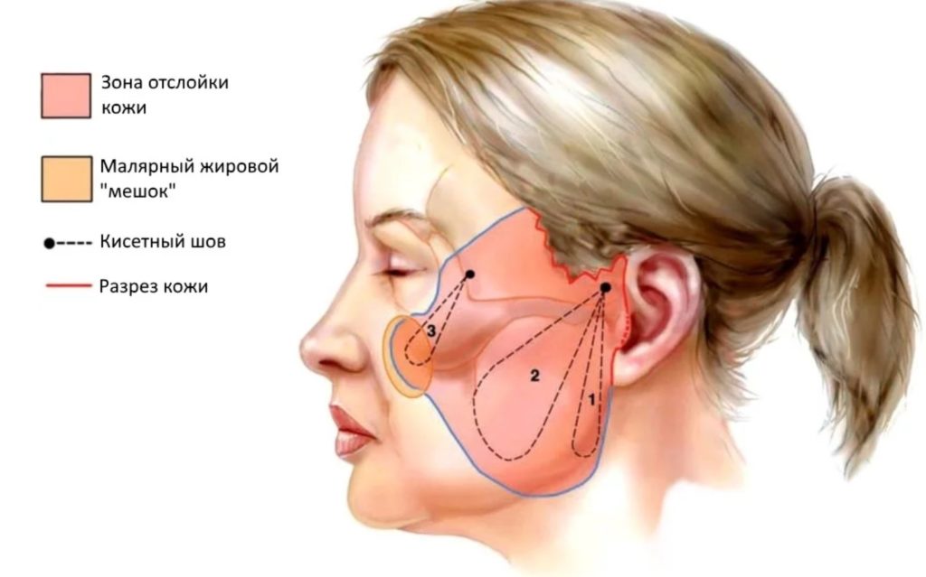 Операция начинается с разреза за ушами или перед ушной раковиной. Далее хирург выделяет и подтягивает ткани СМАС-слоя, которые прикрепляет подвешивающими швами к надкостнице скуловой кости.
