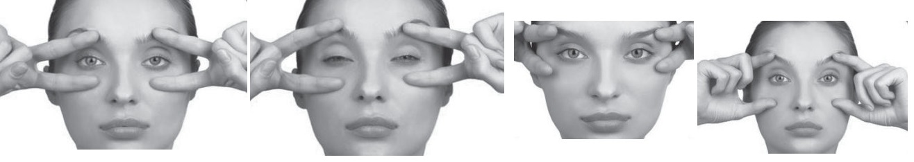 Поместить указательные пальцы на лбу над бровями, большие пальцы расположить ниже глаз. Прикрыть веки. Раздвигать пальцы от век наружу, мягко оказывая давление. Делать это упражнение 40 секунд и затем отдохнуть.