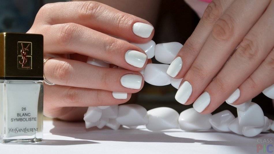 Белый лак вызывает приятные ассоциации чистоты и женственности, лета, белого песка, моря. Такой цвет очень идет длинным худым пальцам и прекрасно смотрится на ногтях любой длинны. Наносить белый лак на ногти следует очень аккуратно, чтобы не задеть всю область вокруг ногтя: