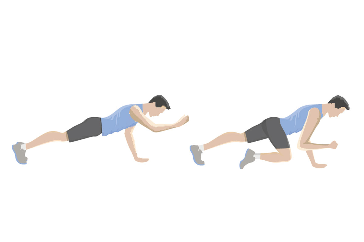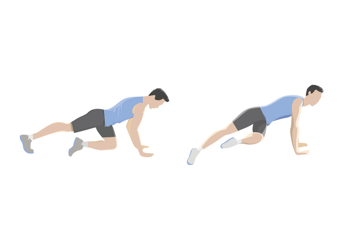 Упражнение для развития косых мышц живота и проработки нижнего пресса. На выходе подтяните колено к груди, одновременно направив к нему противоположный локоть — скручиваясь внутрь. Следите за тем, чтобы плечи не поднимались слишком высоко от пола.