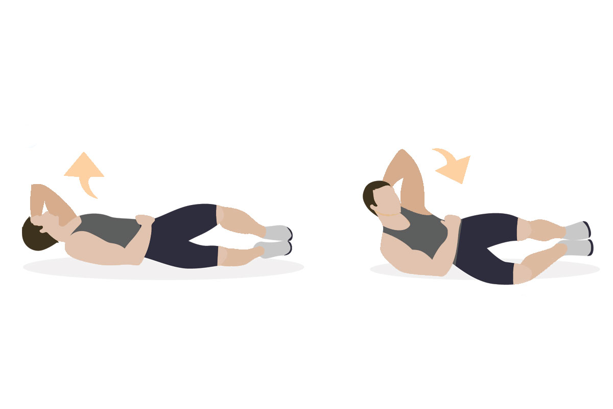 Исходное положение — аналогично предыдущему упражнению. Заложите руки на голову. Медленно приподнимите верх корпуса, направляя локти к коленям — максимально сокращая пресс при скручивании. Следите за тем, чтобы руки не давили на голову. Выполните 3-4 подхода по 12-15 повторений.