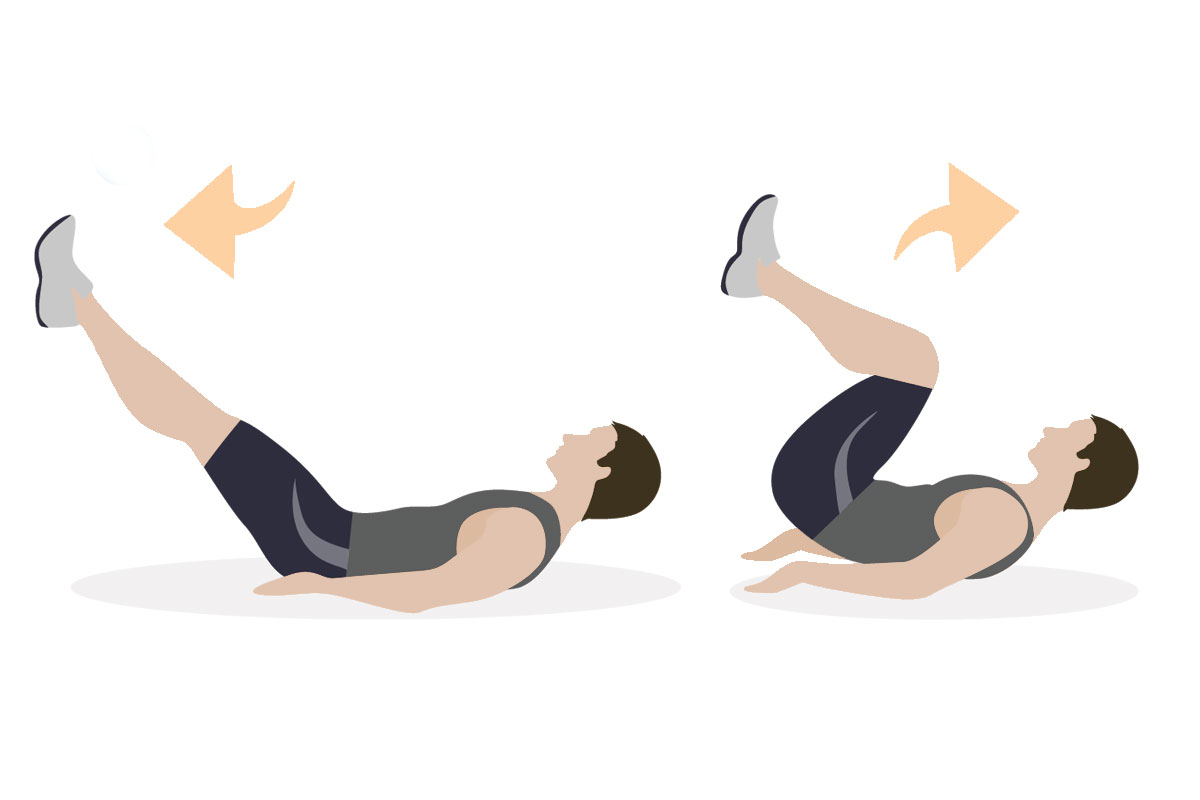 2. Боковые скручивания на спине. Данное упражнение предназначено для развития нейромышечной связи между мышцами пресса и мозгом. Лежа на спине, медленно тянитесь локтем левой руки к правому колену. Выполните 12-15 раз для каждой стороны, стараясь добиться характерного жжения в боковом прессе.